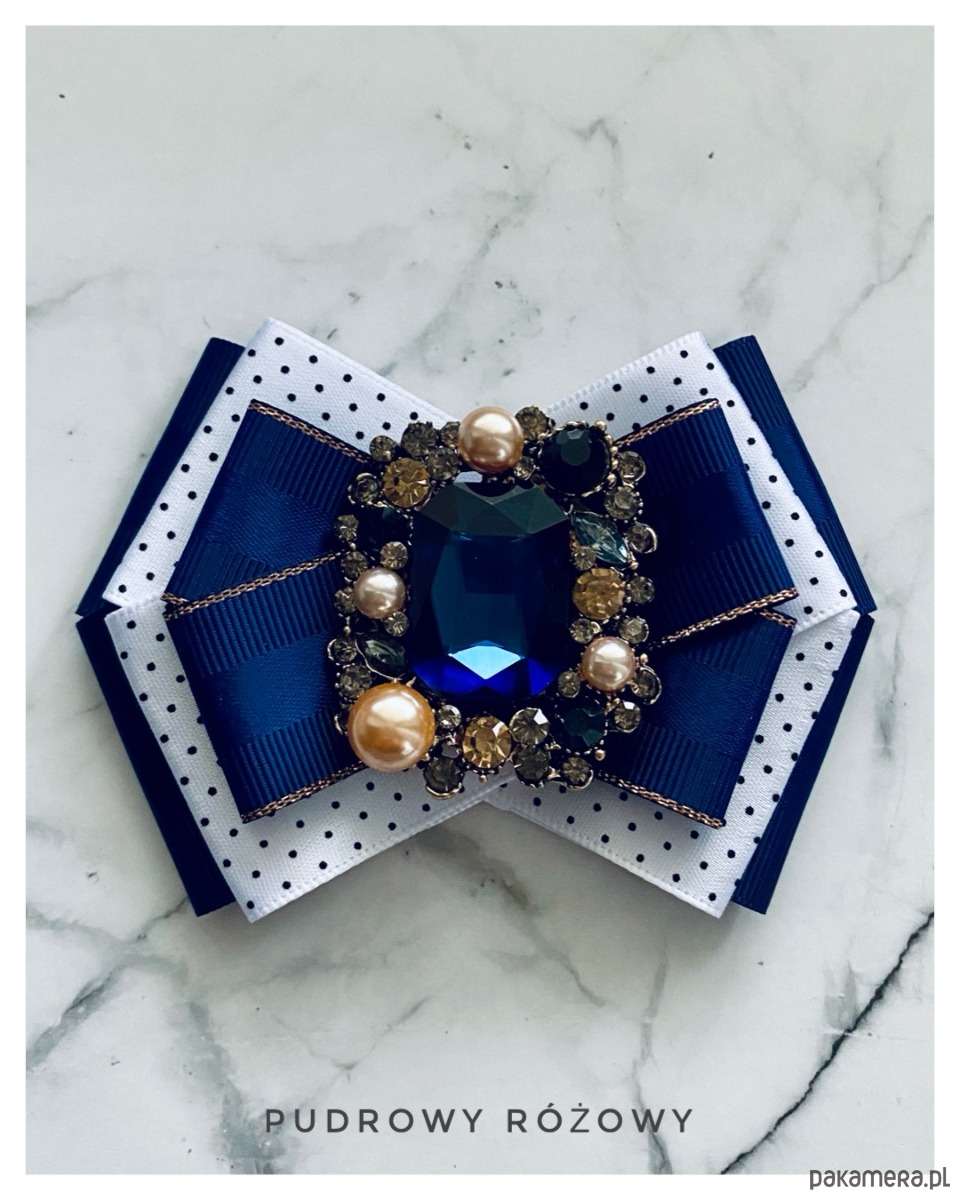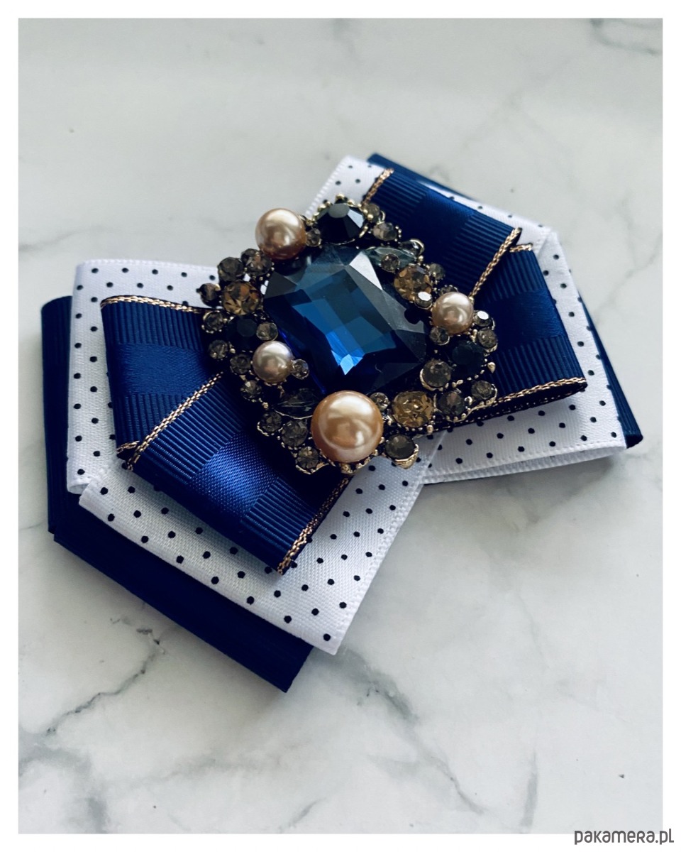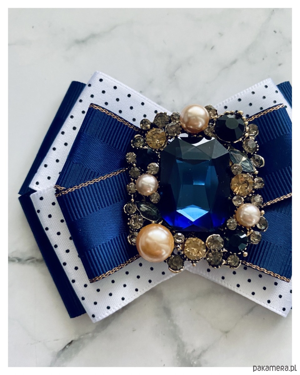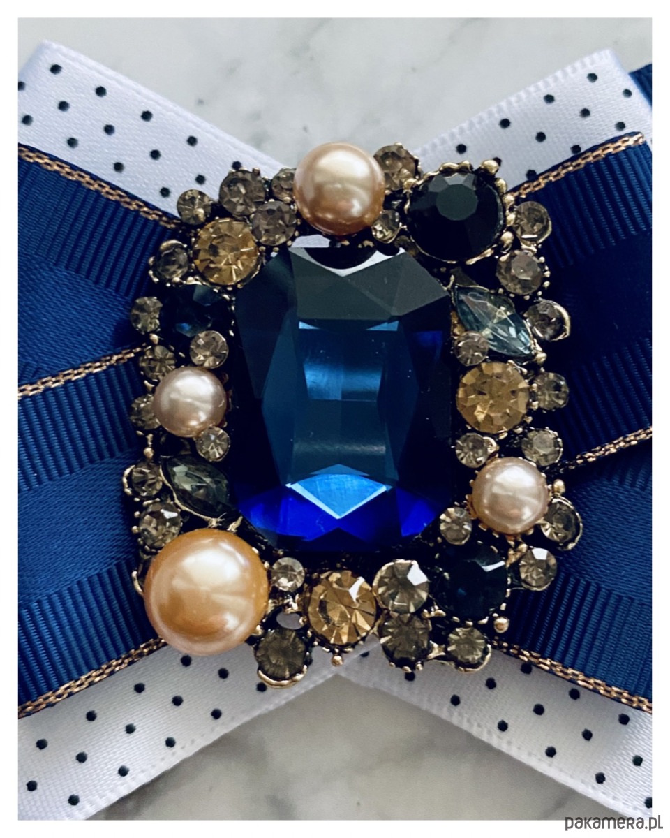 Na środku naszyta piękna ozdoba biżuteryjna. Duży kryształ w soczystym kolorze granatowym w ażurowej oprawie wysadzanej drobnymi kryształkami i perłami różnej wielkości.