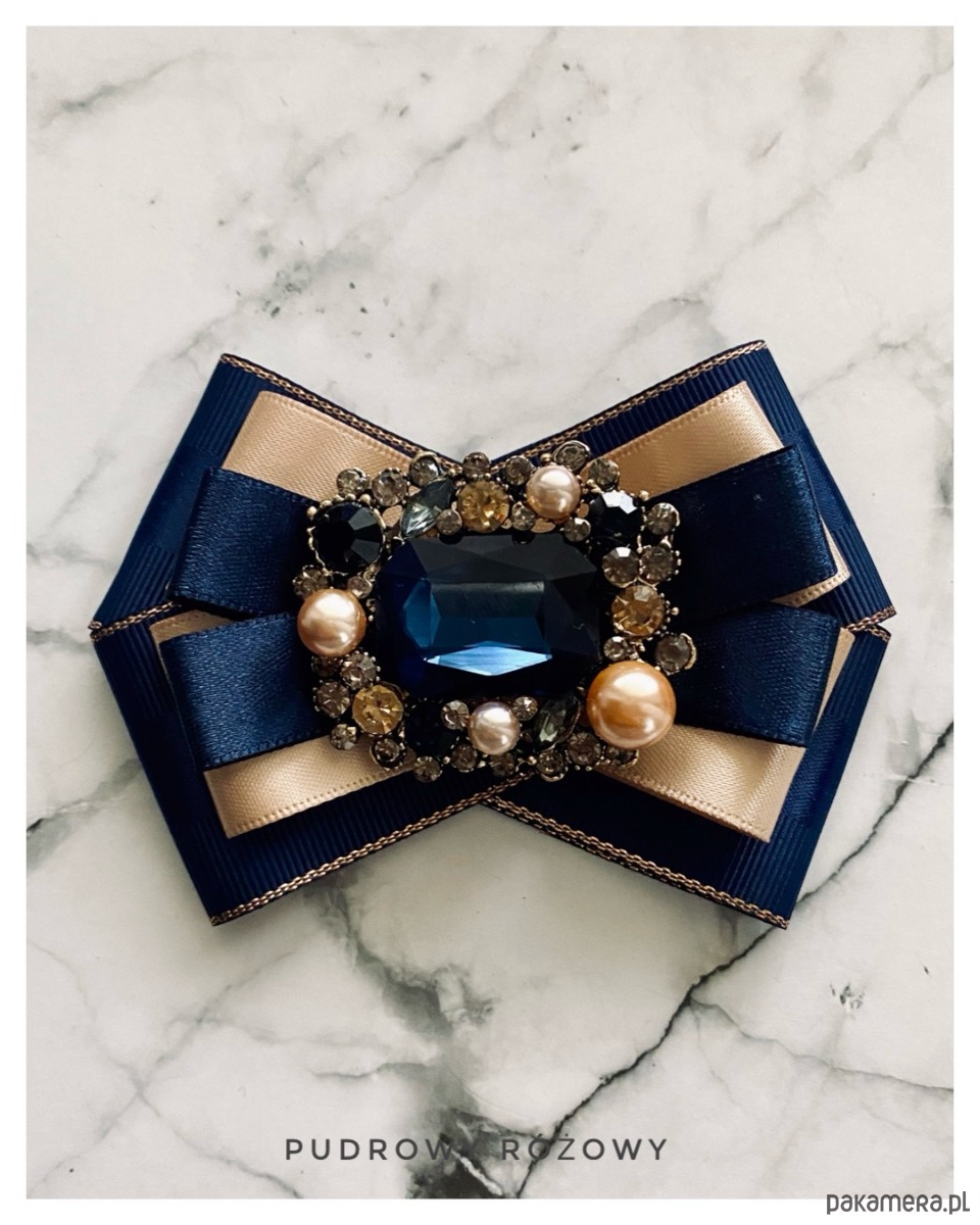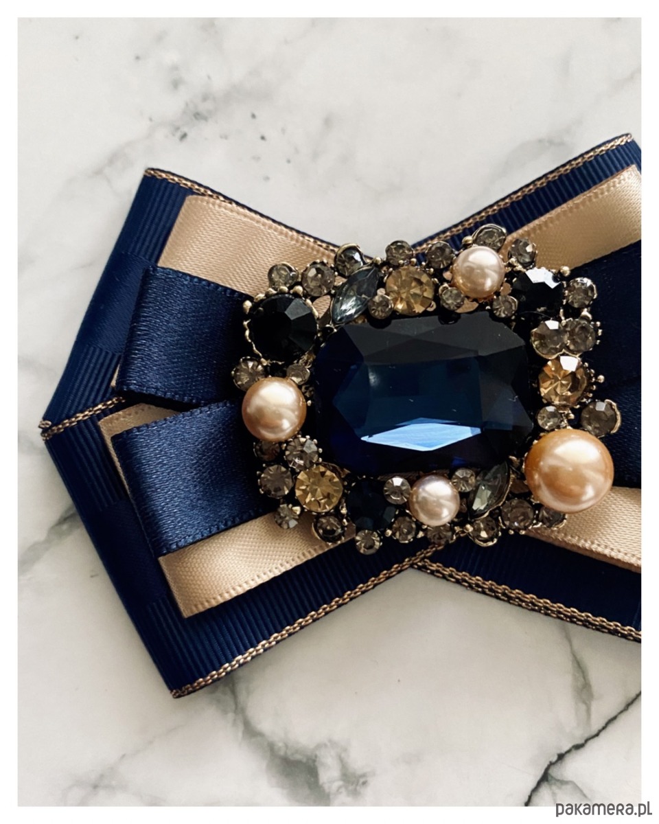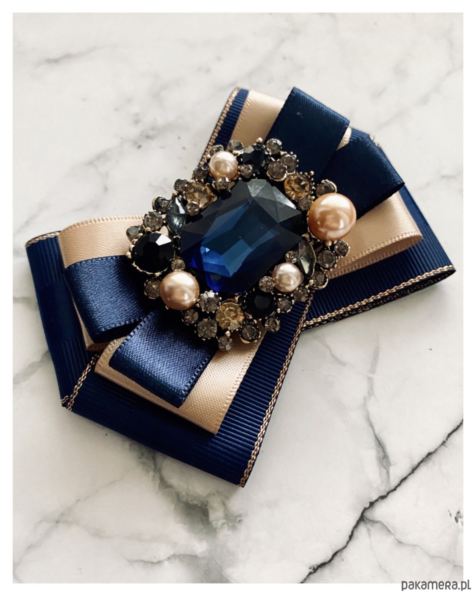 Na środku naszyta piękna ozdoba biżuteryjna. Duży kryształ w soczystym kolorze granatowym w ażurowej oprawie wysadzanej drobnymi kryształkami i perłami różnej wielkości.