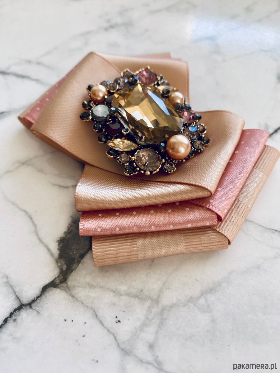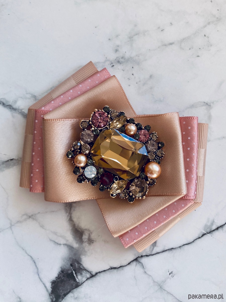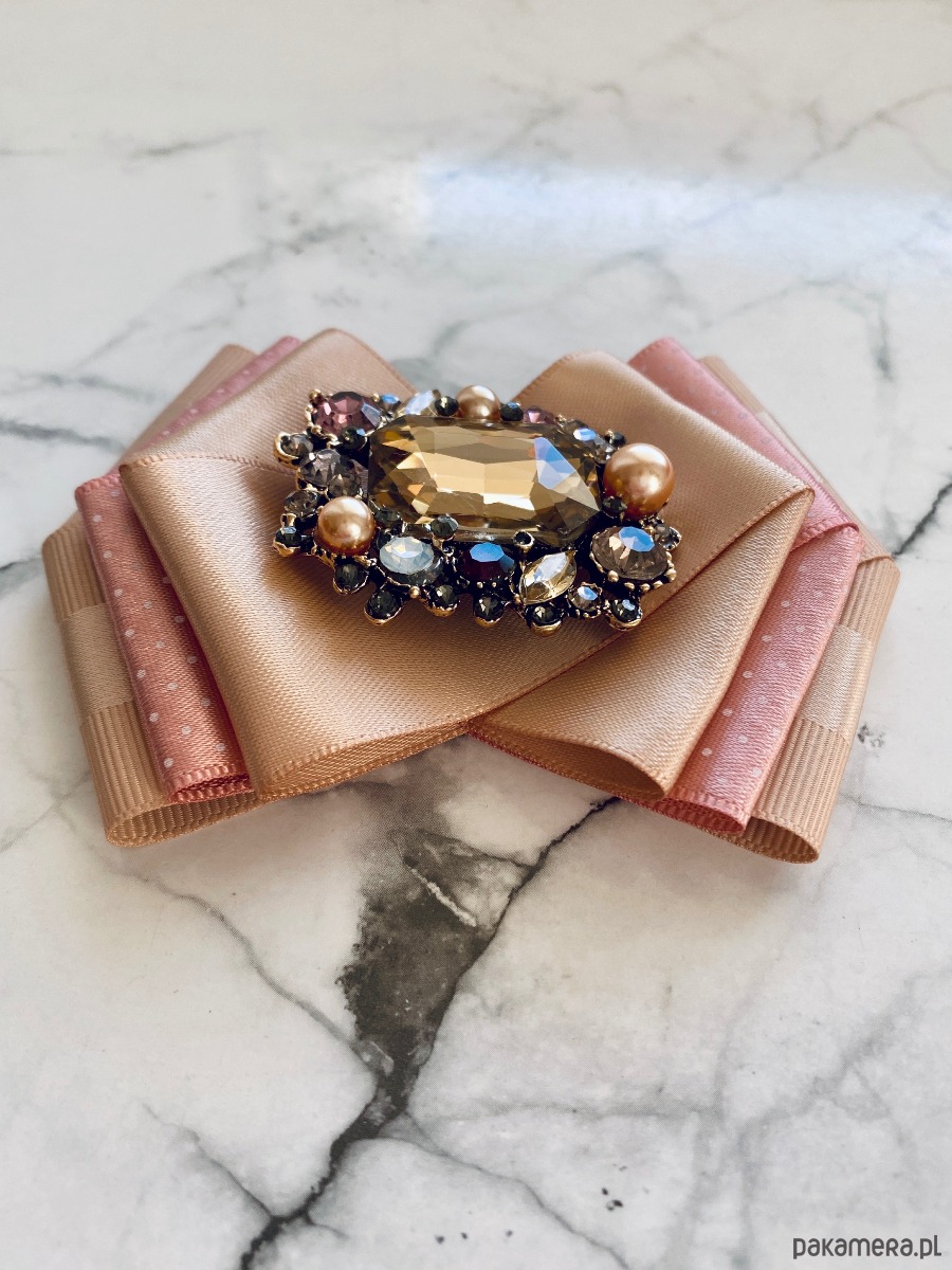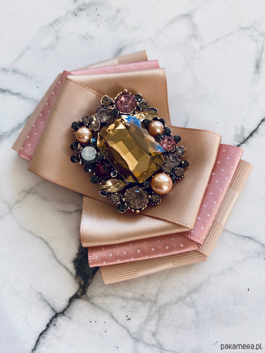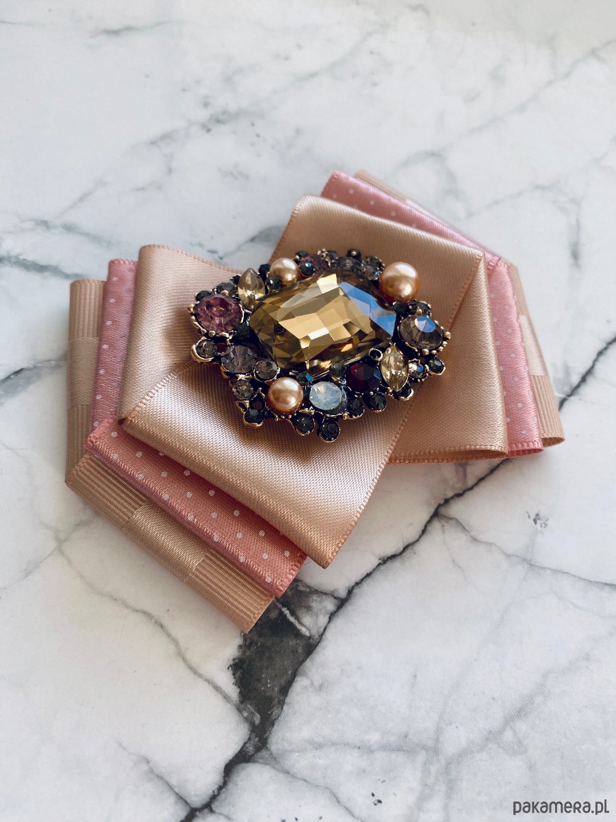 Broszka wykonana z wysokiej jakości taśm i dodatków.