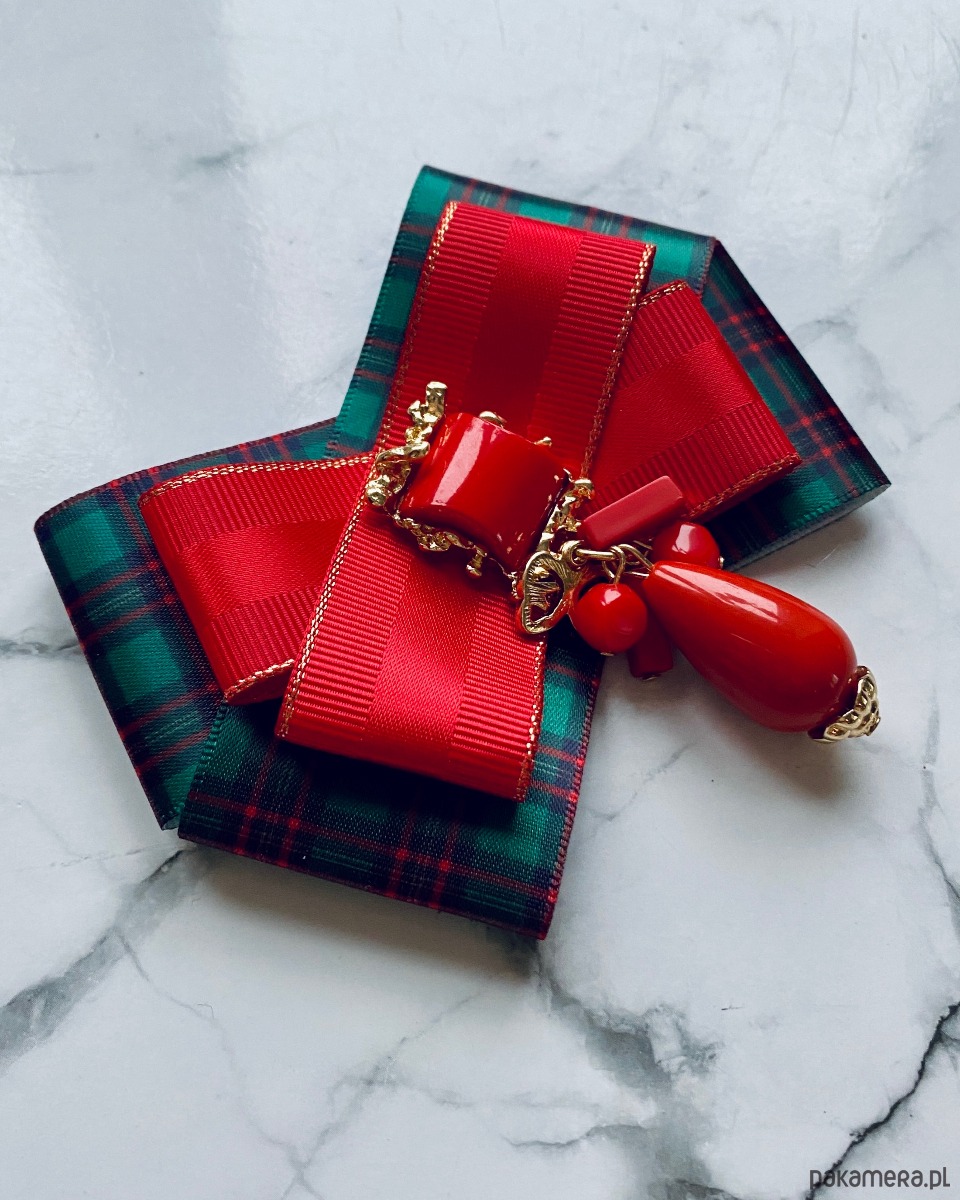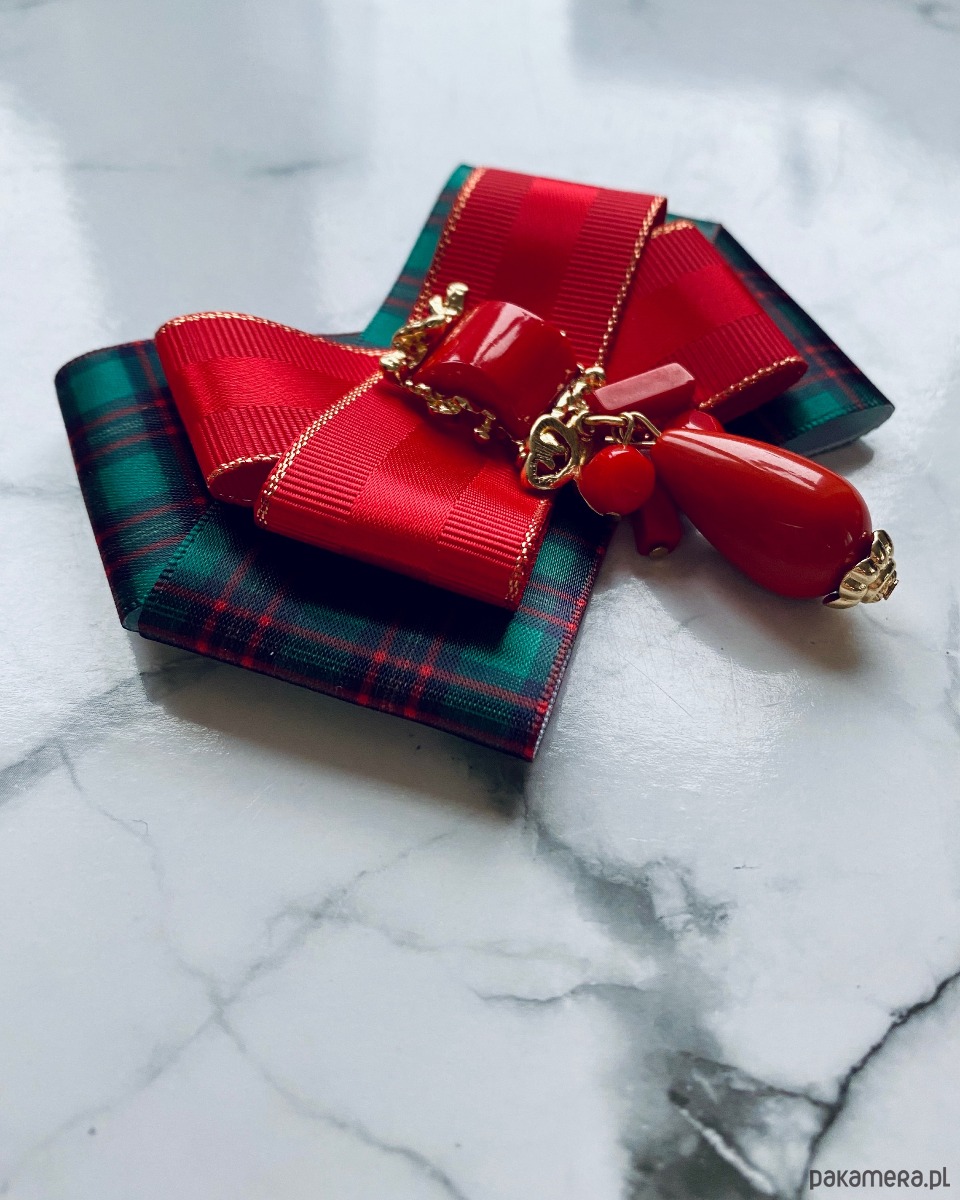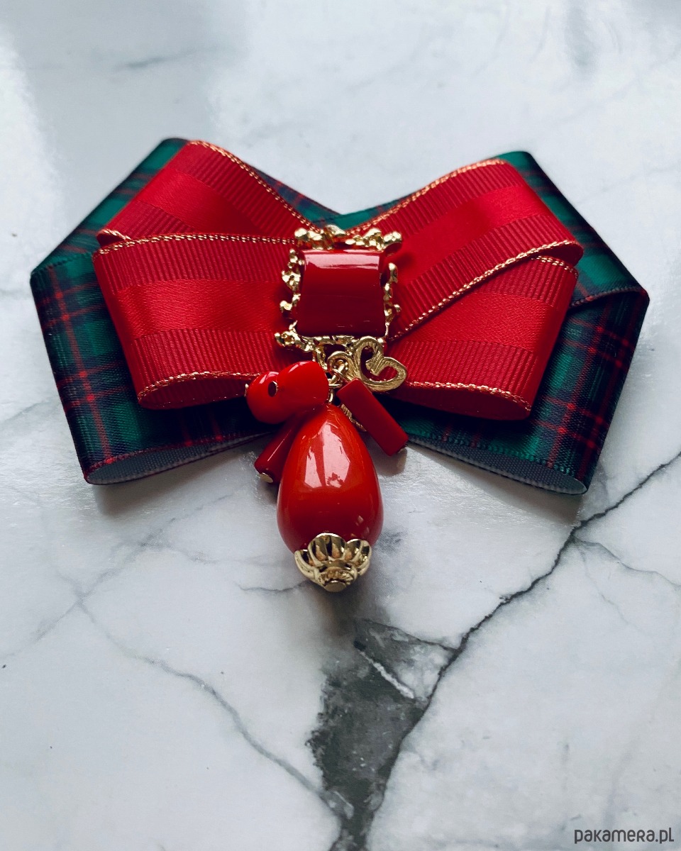 Broszka wykonana z wysokiej jakości taśm i dodatków.
