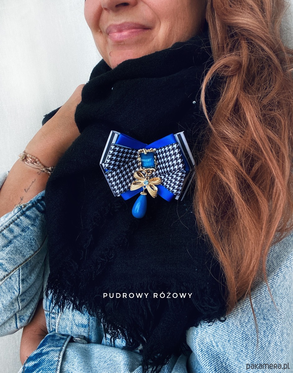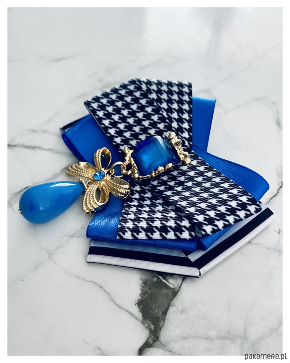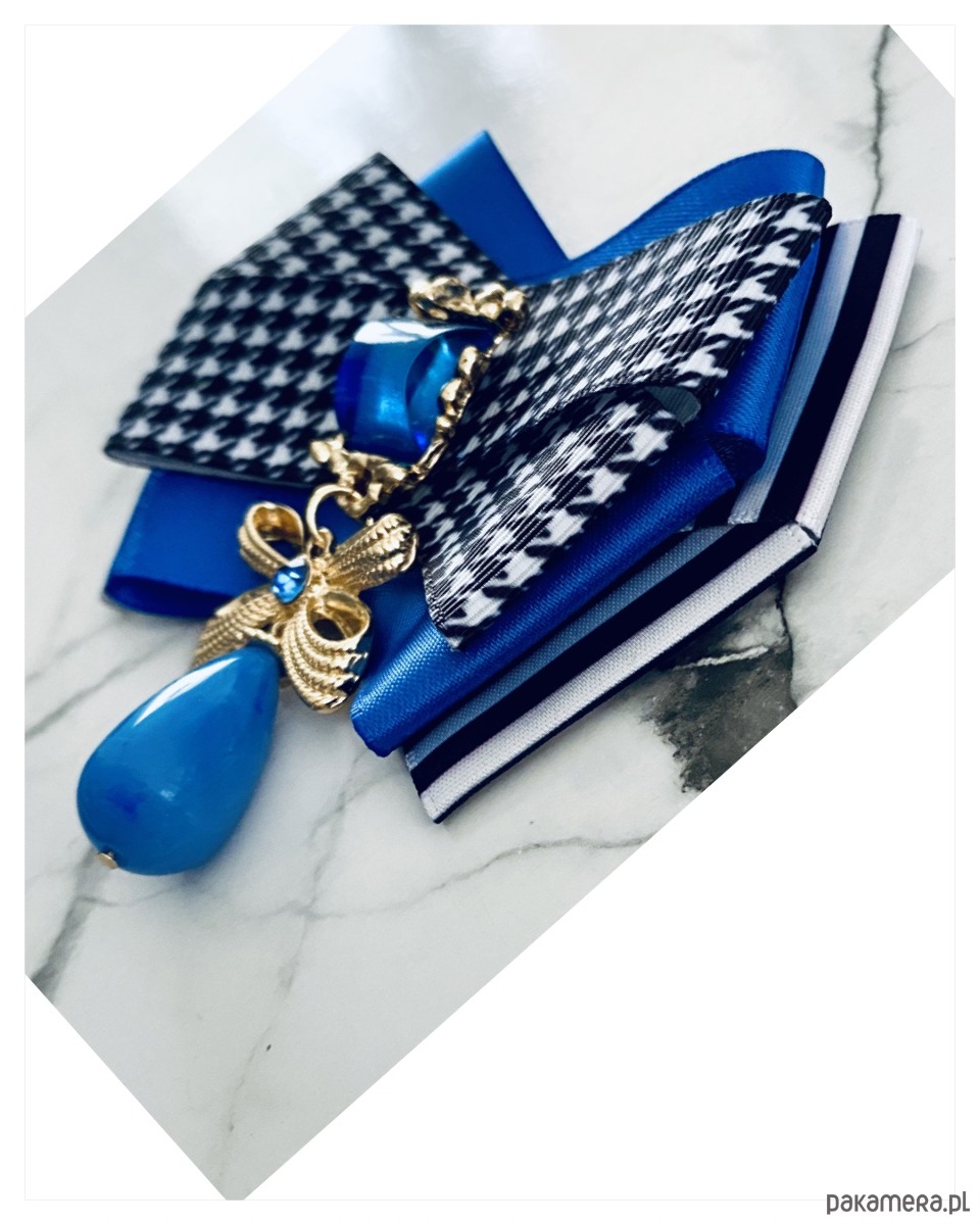 Broszka w kolorze czerni, bieli i chabrowego niebieskiego.