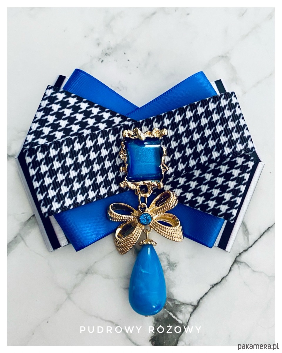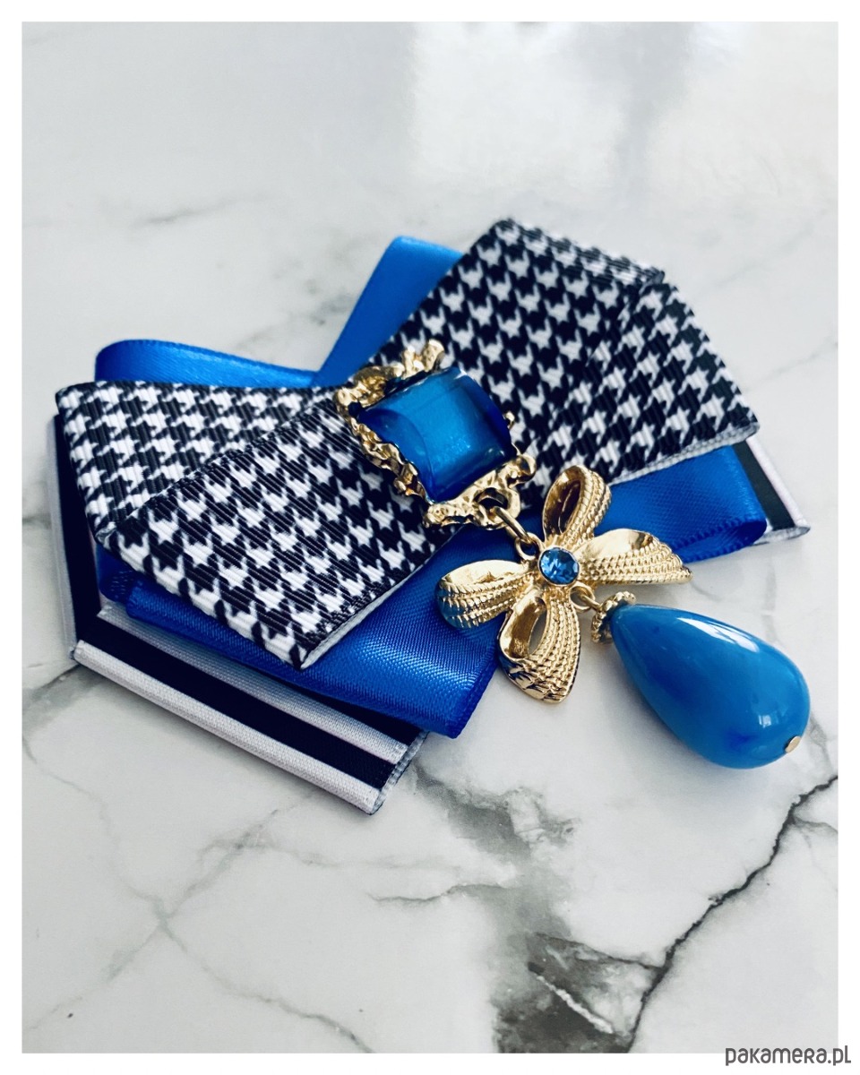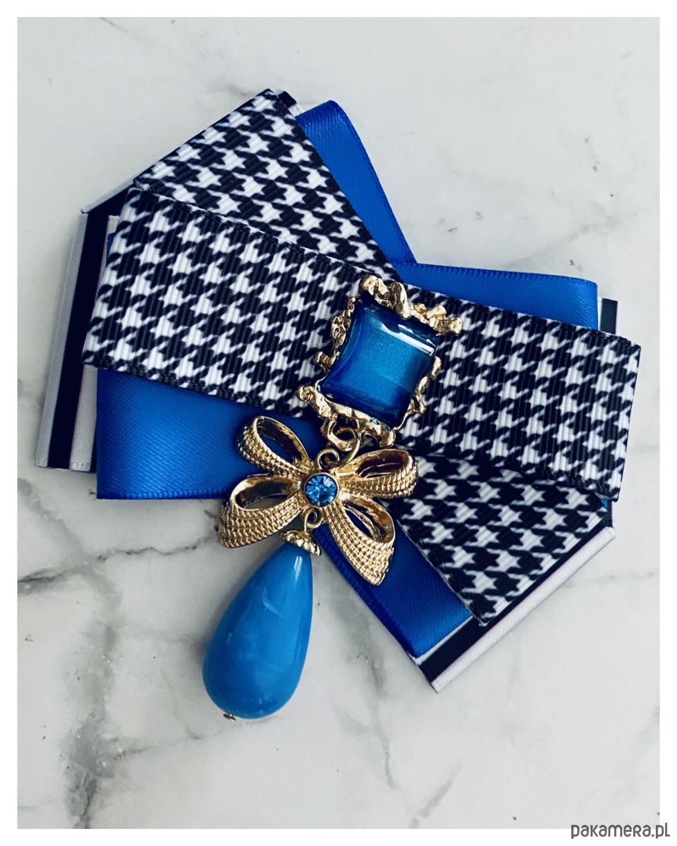 Broszka w kolorze czerni, bieli i chabrowego niebieskiego.