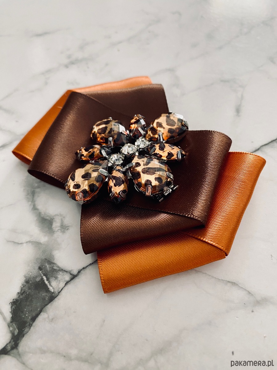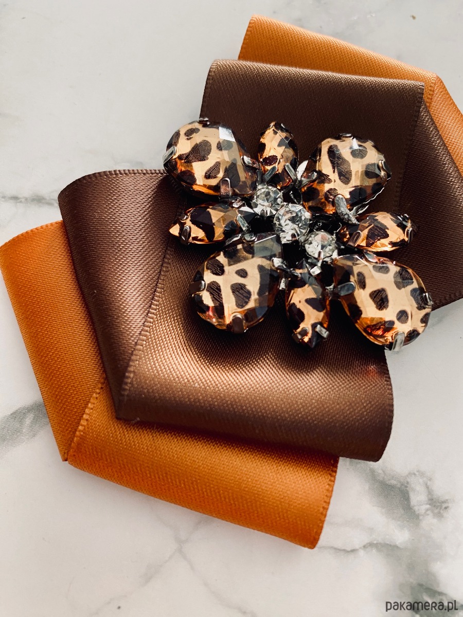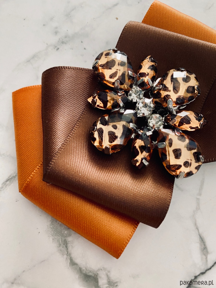 Broszka wykonana z wysokiej jakości taśm i dodatków.
