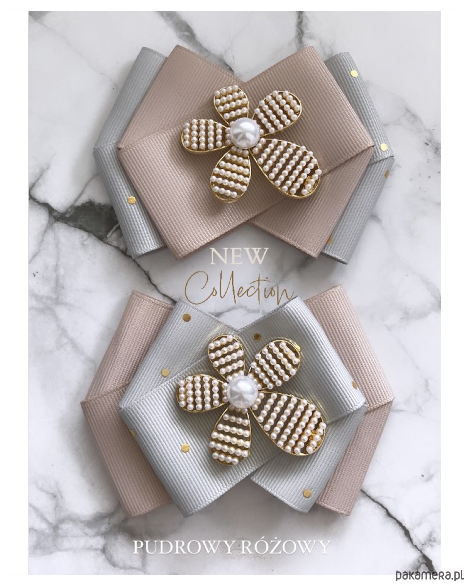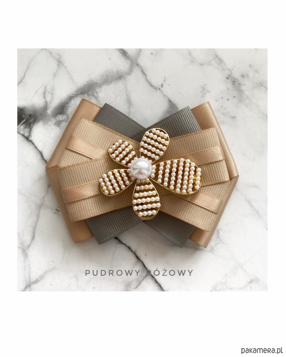 Na środku naszyta cudowna ozdoba biżuteryjna, okazały kwiat wykonany z drobniutkich delikatnych perełek. Na środku duża perła w kolorze małych perełek.