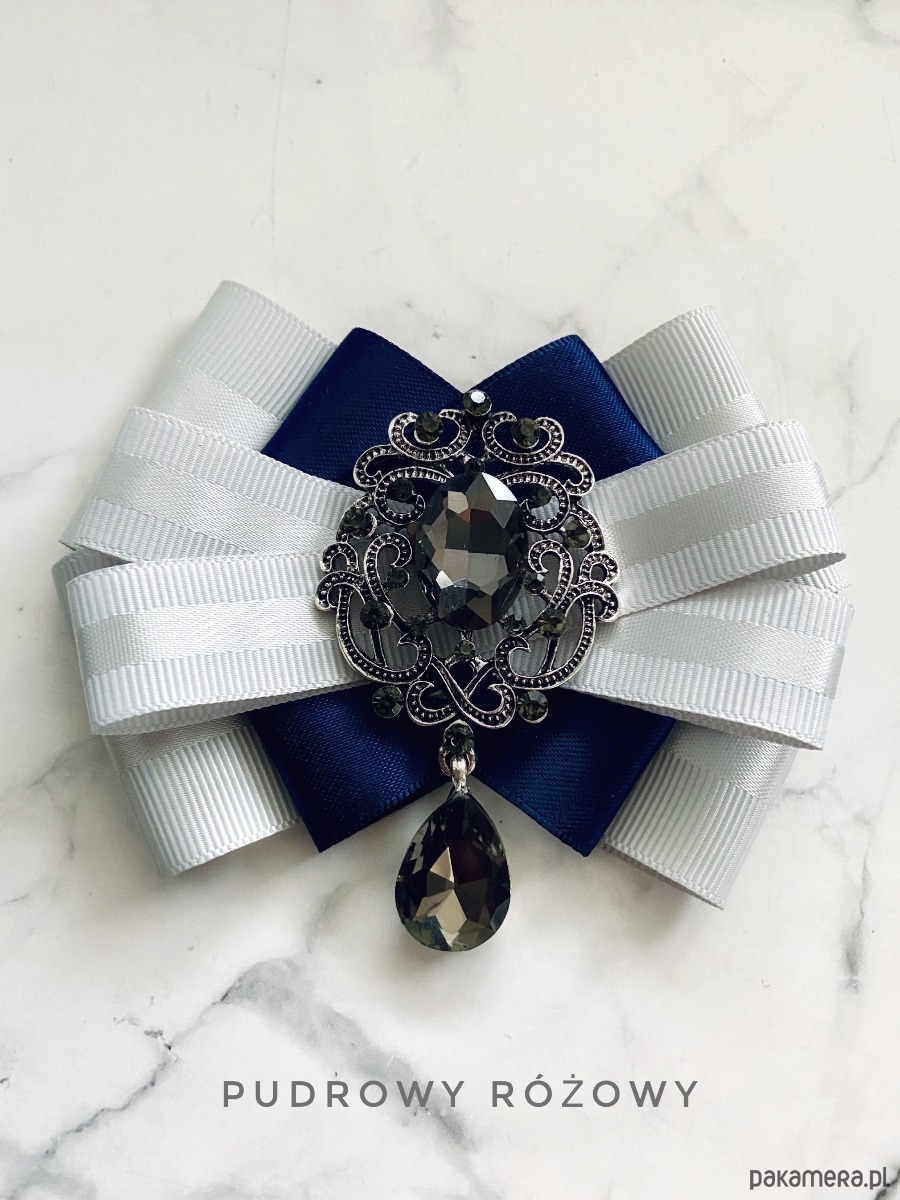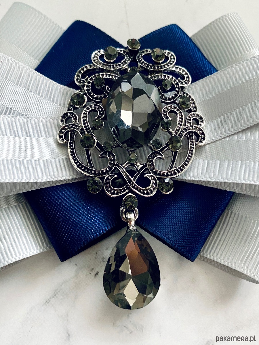 Na środku naszyta cudowna ozdoba biżuteryjna kryształy w kolorze szarym w oprawie w kolorze grafitu z drobnymi kryształkami.