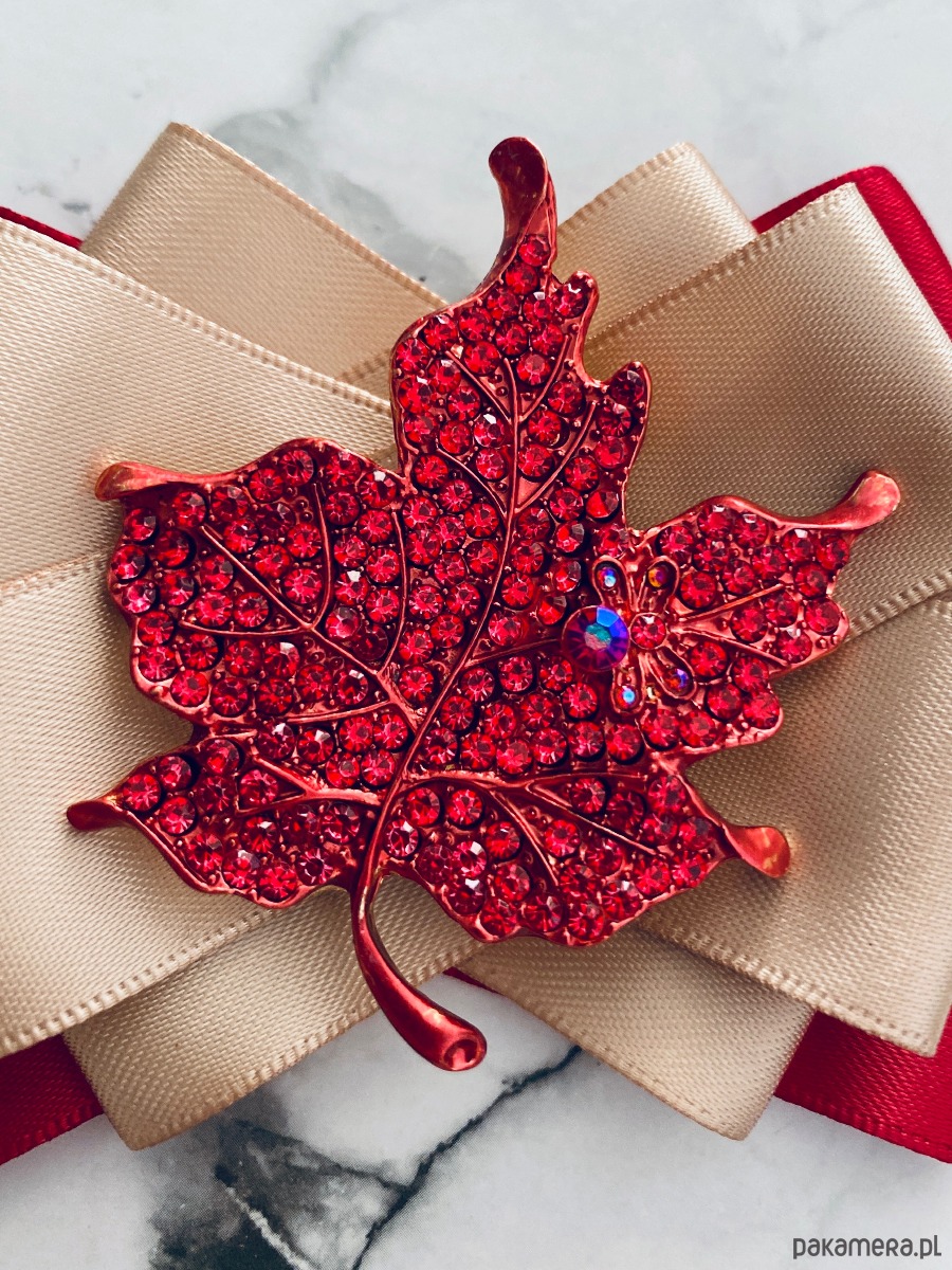Brosza z unikatowym liściem z czerwonych kryształków Liść