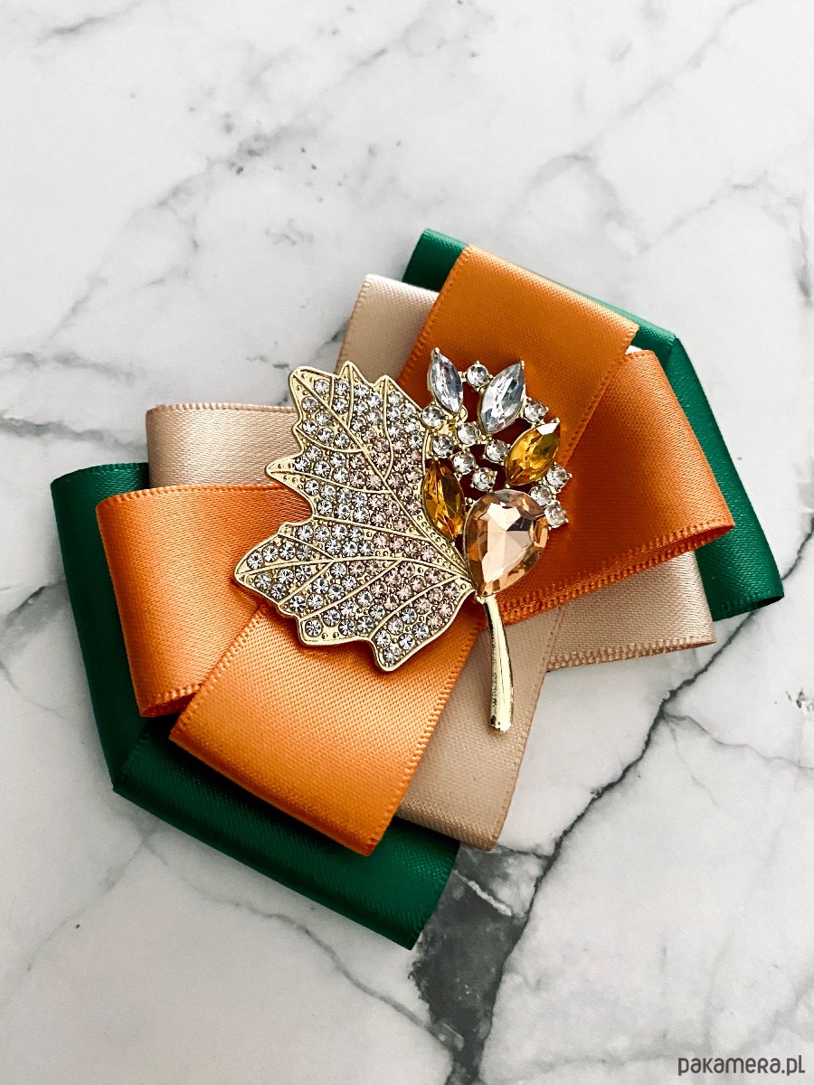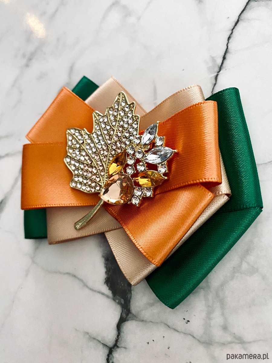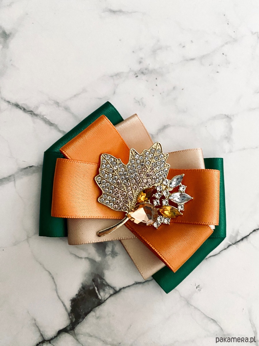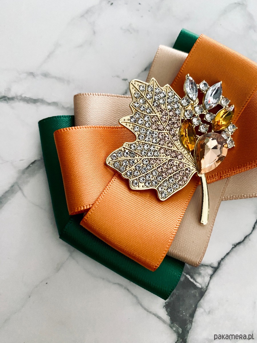 Broszka wykonana z wysokiej jakości taśm i dodatków.