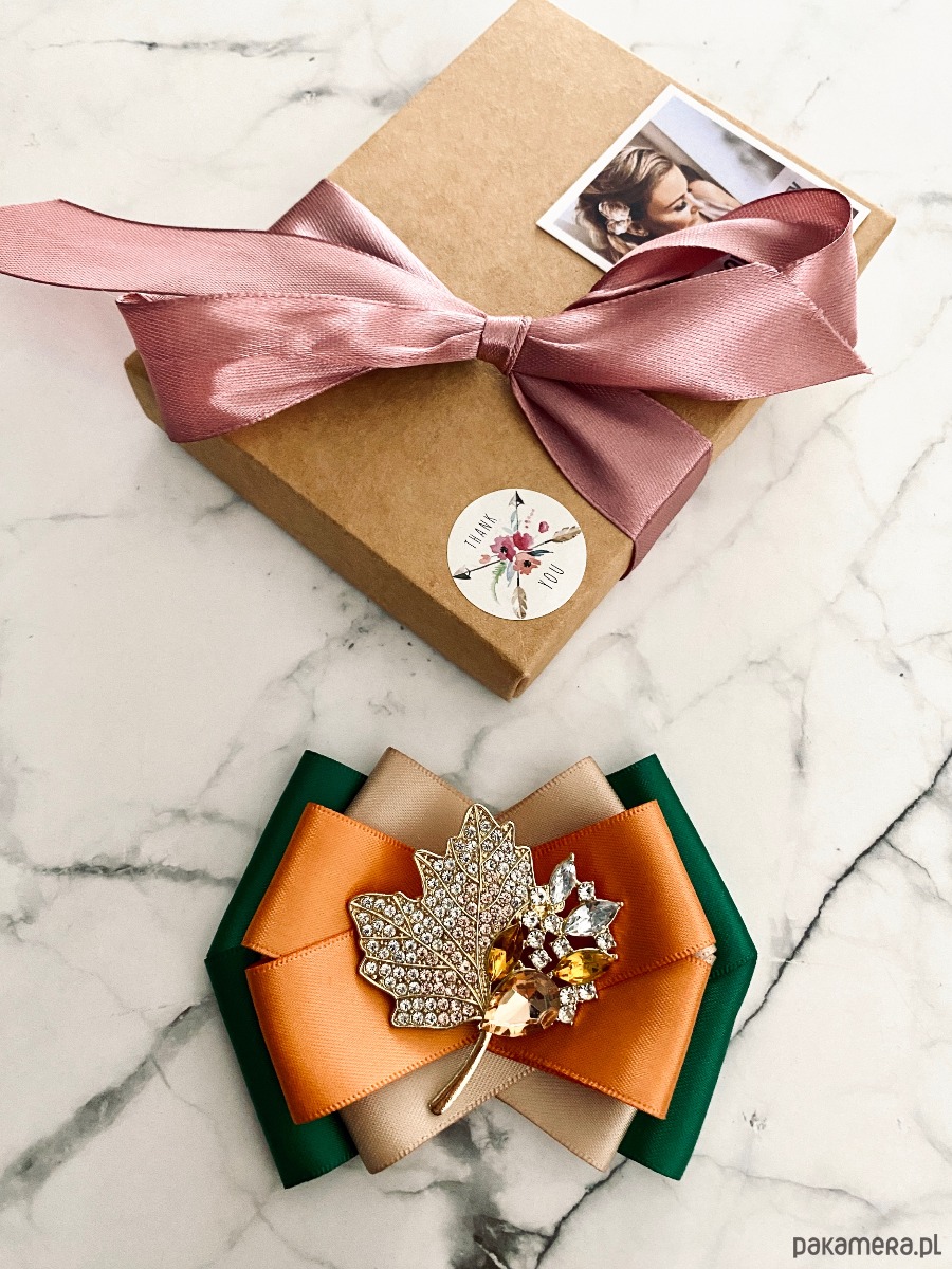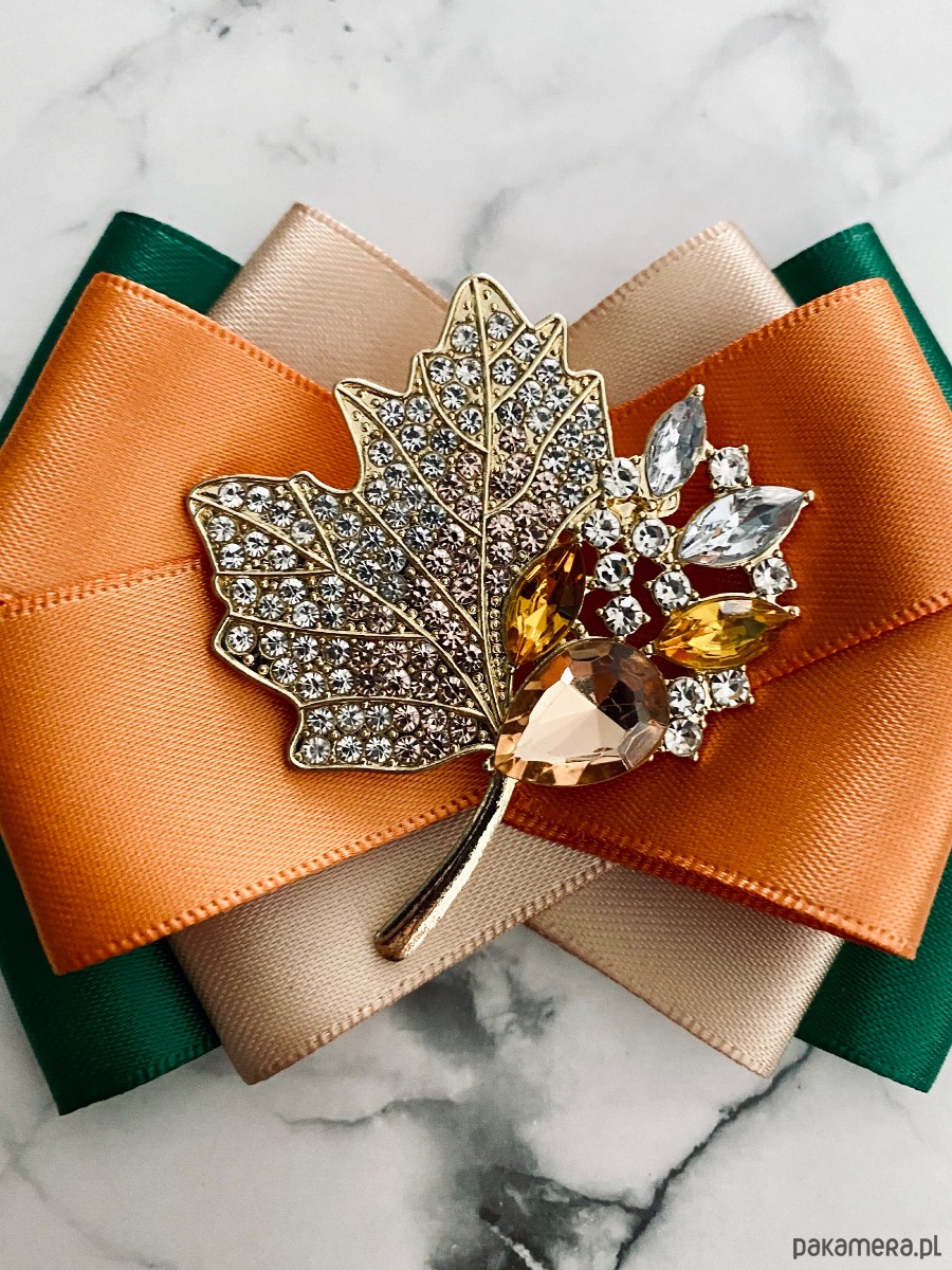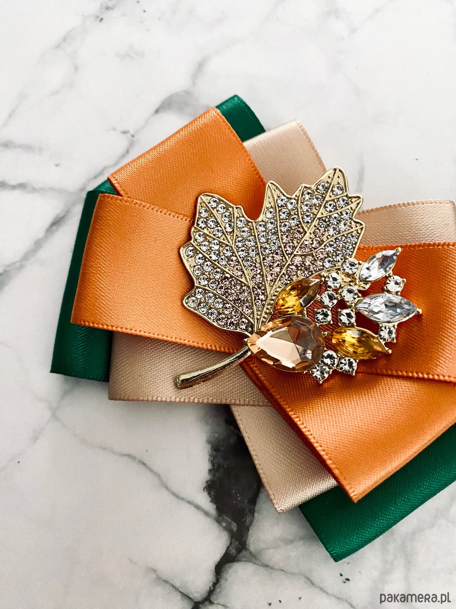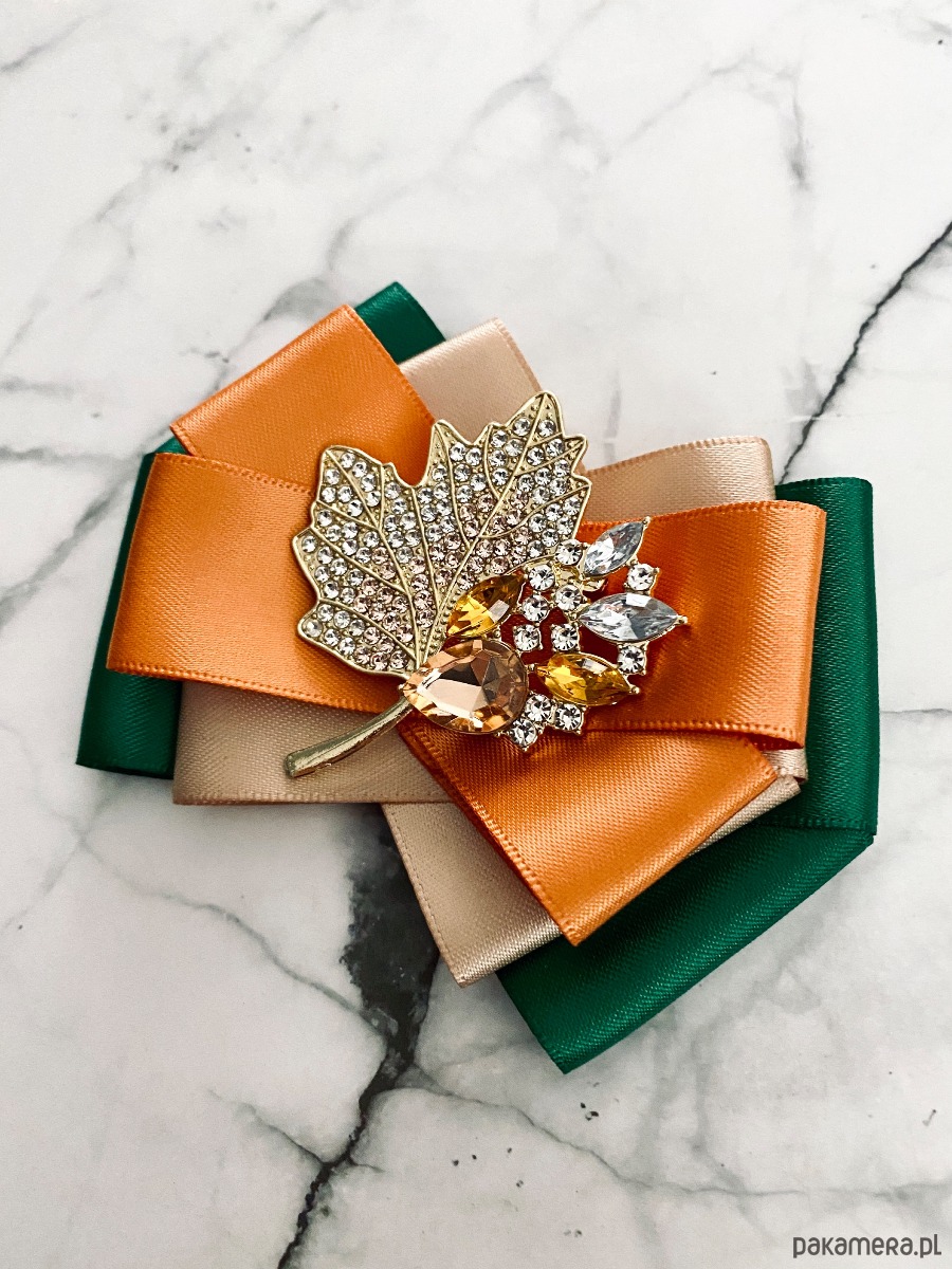 Broszka wykonana z wysokiej jakości taśm i dodatków.
