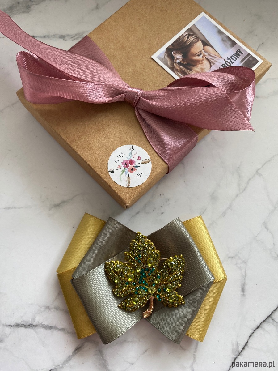 Broszka wykonana z wysokiej jakości taśm i dodatków.