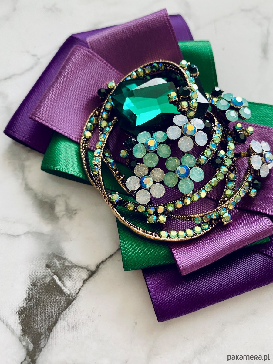 Brosza z niezwykle ciekawą ozdobą biżuteryjną, dużym zielonym kryształem oplątanym wstęgami z kryształków i drobnych kwiatków. Ozdoba jest wyjątkowa i bardzo dekoracyjna, jest trójwymiarowa.