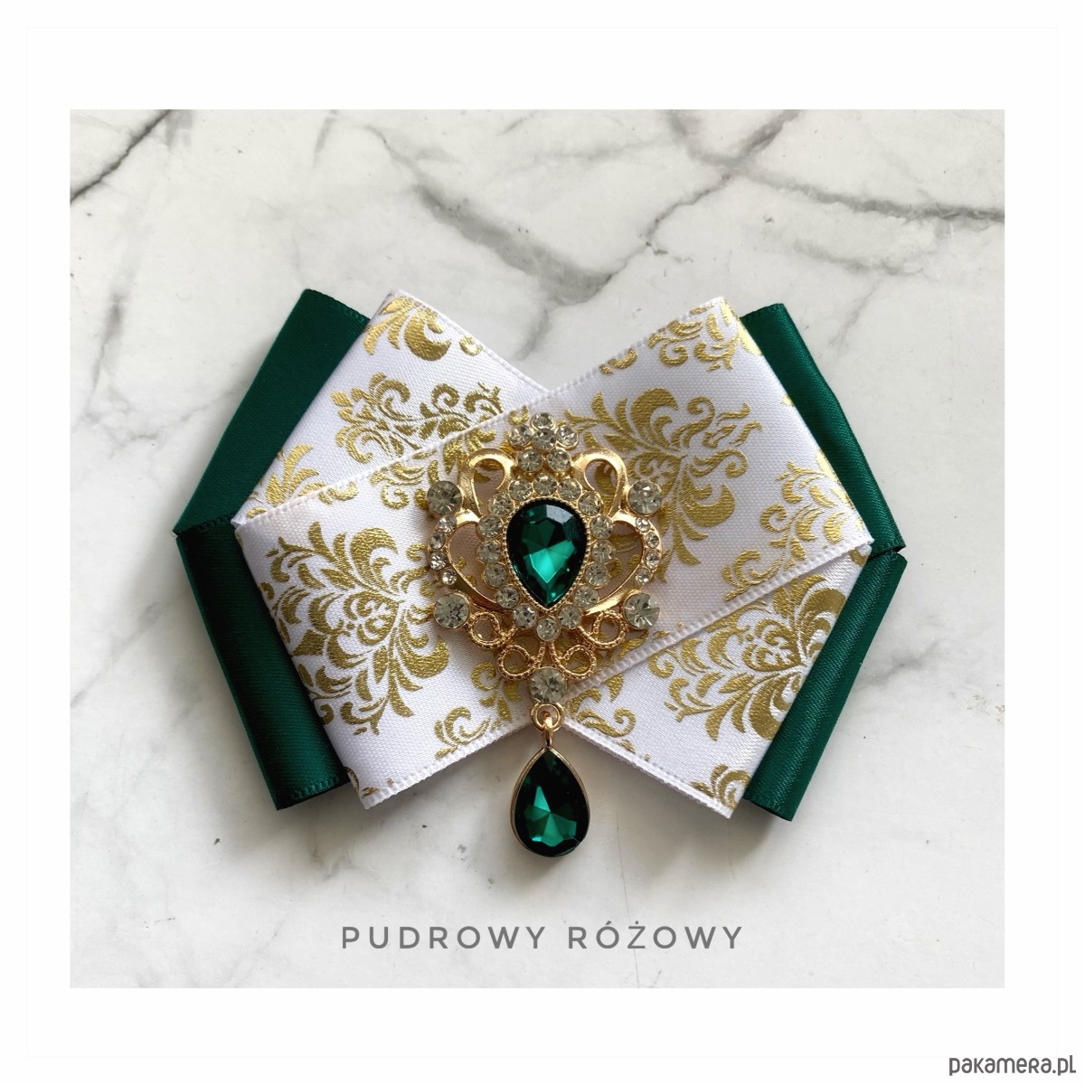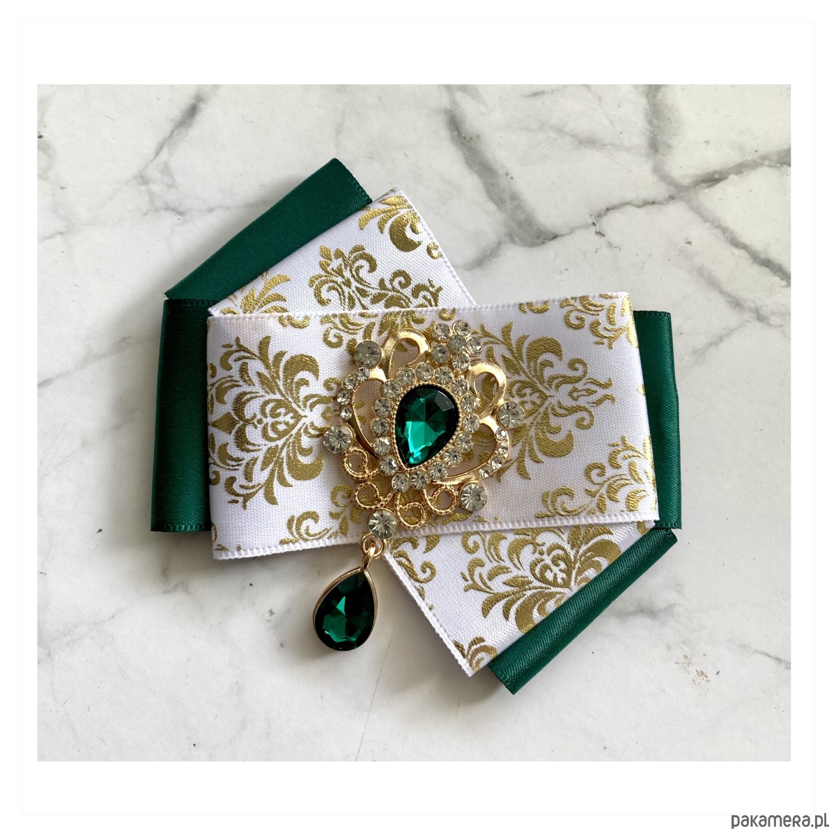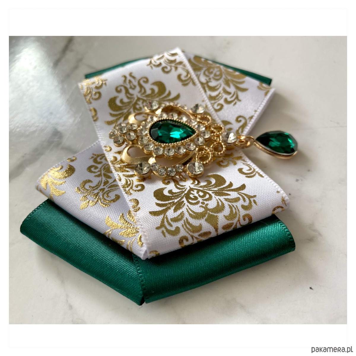 Broszki wykonane z wysokiej jakości taśm i dodatków. Na środku dekoracyjna ozdoba z zielonym kryształkiem. Będą idealnie pasować zarówno do koszul, bluzek, swetrów, sukienek, żakietów oraz do płaszczy, kurtek, szali i chust. Idealna do każdej stylizacji, zarówno do sportowej jak również do eleganckich stylizacji.