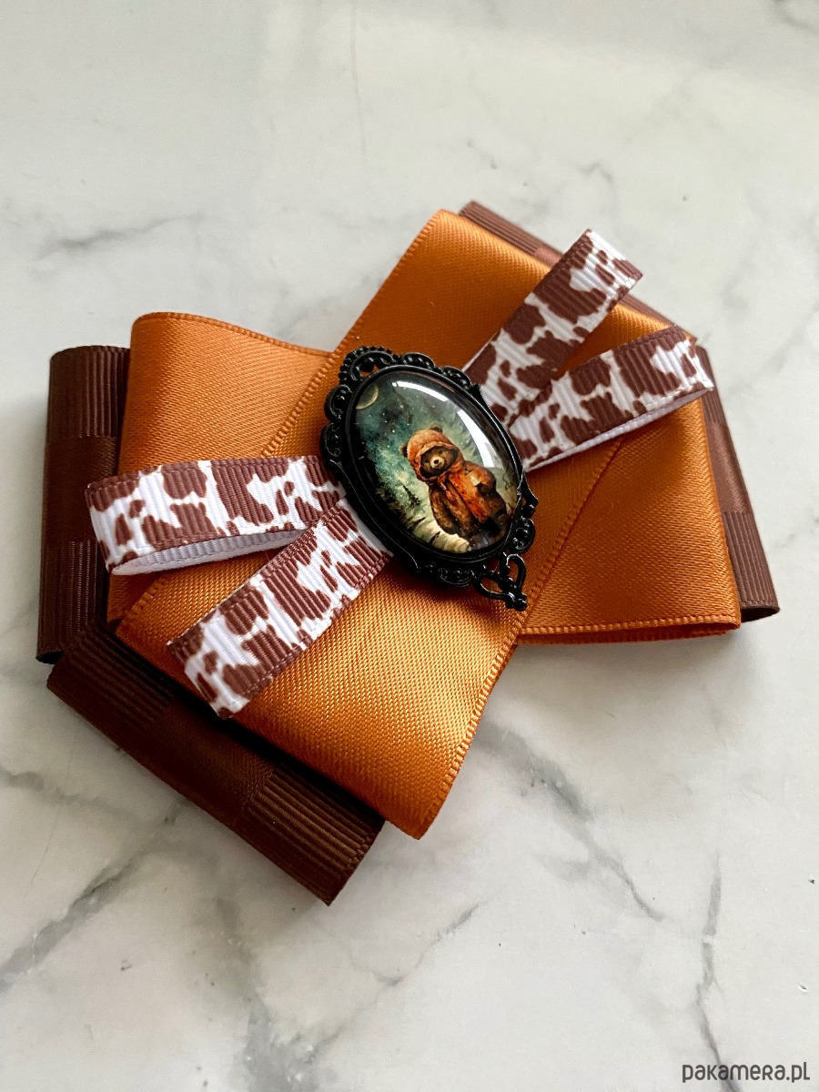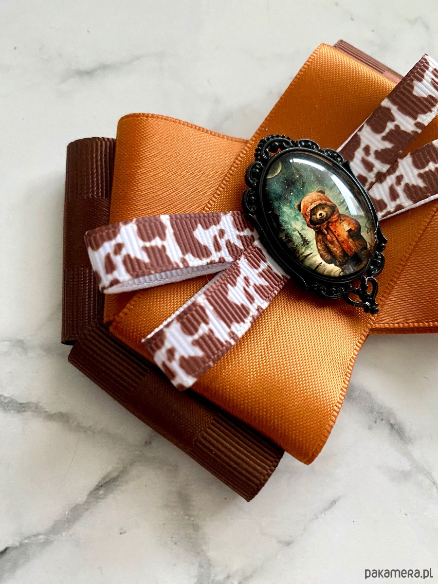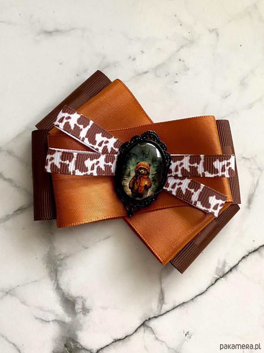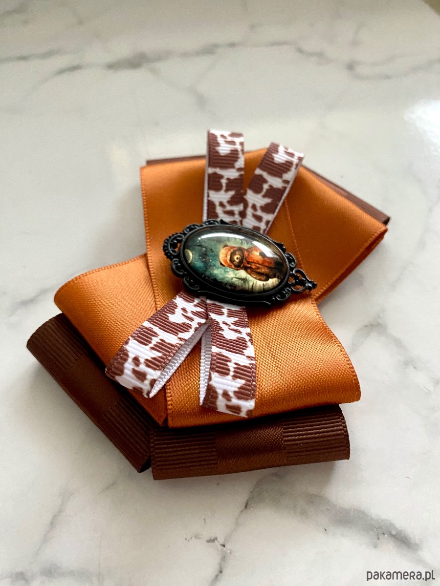 Broszka wykonana z wysokiej jakości taśm i dodatków.