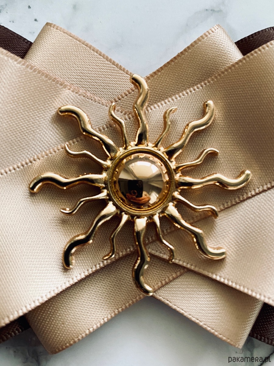 Na środku piękna i delikatna ozdoba biżuteryjna. Bardzo kobieca i mistyczną. Duże słońce w kolorze złotym.
