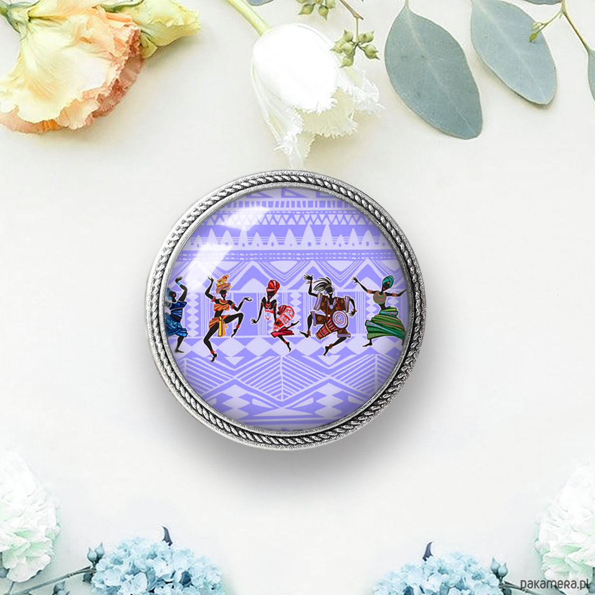 Efektowna broszka ze szkłem artystycznym z grafiką, w oprawie w kolorze srebra. Pięknie ozdobi Twój ubiór- bluzkę, sweterek, żakiet a także szal lub czapkę.