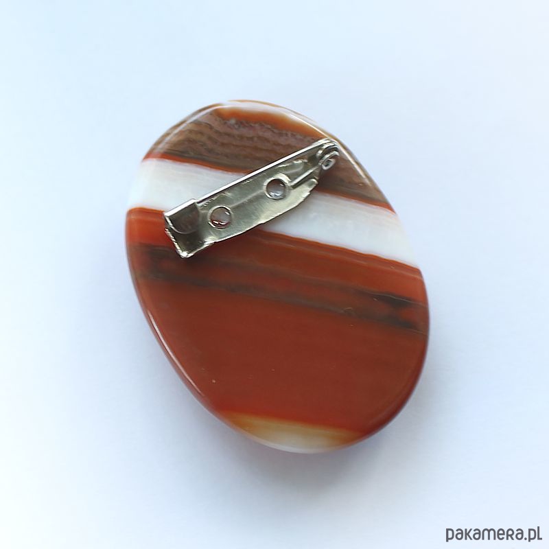 Ręcznie wykonana broszka kaboszonowa z pięknym, oryginalnym agatem w odcieniach zgaszzonej czerwieni, bieli i brązu. Idealny stylowy dodatek do garderoby lub wnętrza!