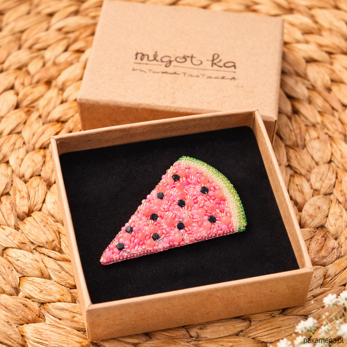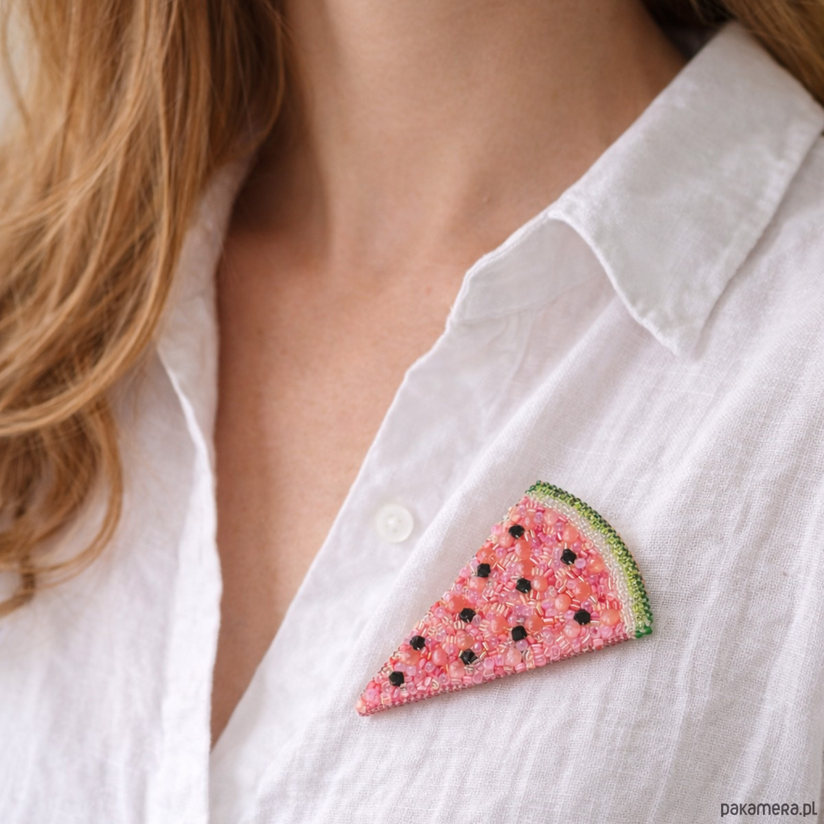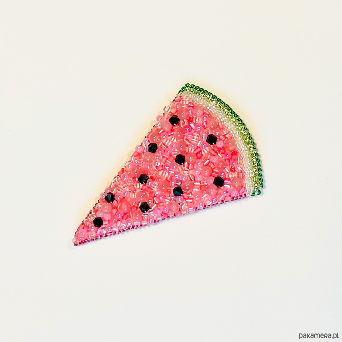 Soczysta, letnia i pełna koloru ręcznie wykonana broszka w kształcie plasterka arbuza, stworzona techniką haftu koralikowego. Każdy element został starannie doszyty, dzięki czemu broszka pięknie mieni się światłem i przyciąga spojrzenia.