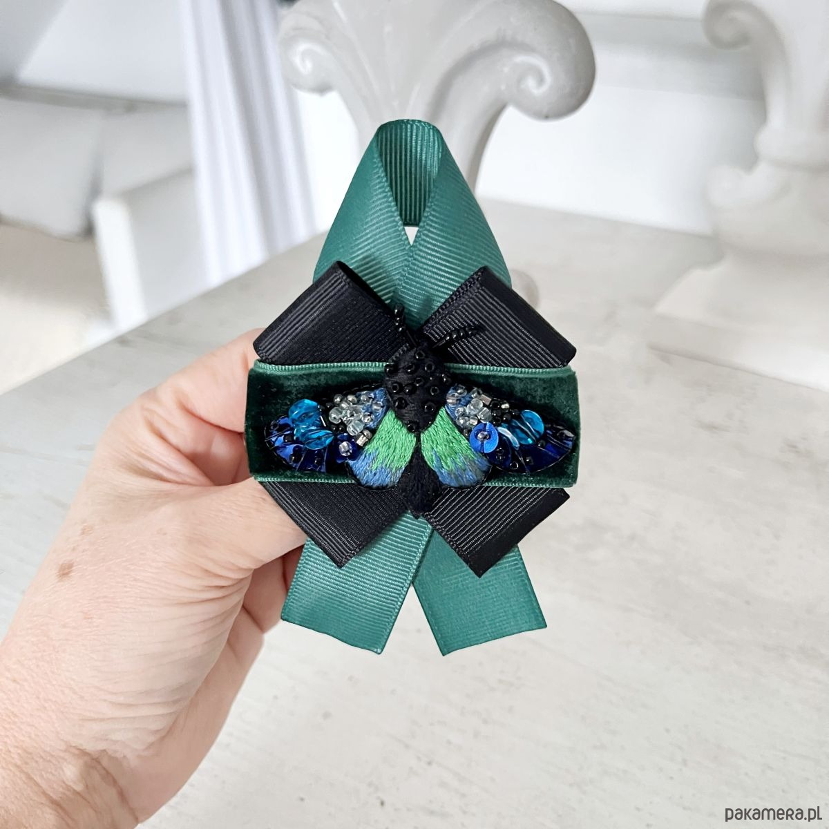 Poznaj broszkę, która przyciąga spojrzenia swoją tajemniczością i wyrafinowaną formą. ĆMA to kompozycja o nocnym, zmysłowym charakterze. W centrum znajduje się ręcznie haftowana ćma, stworzona z dbałością o najmniejsze detale. Połyskujące koraliki, subtelne przejścia kolorów i delikatna faktura haftu budują wrażenie ruchu, jakby skrzydła za chwilę miały unieść się w powietrze. Haft osadzony jest na kontrastowym tle z wstążek, które dodają broszce objętości i elegancji, a jednocześnie podkreślają jej dekoracyjny charakter.