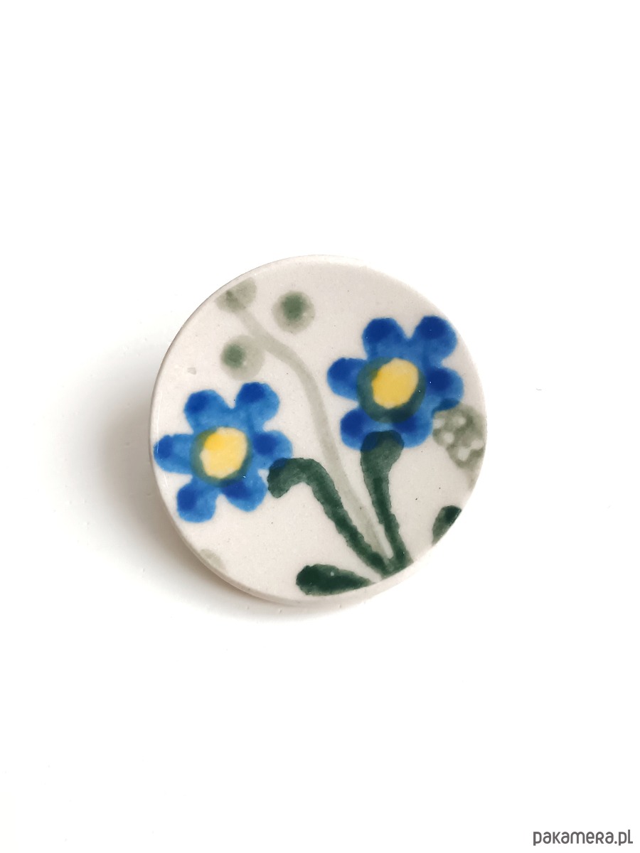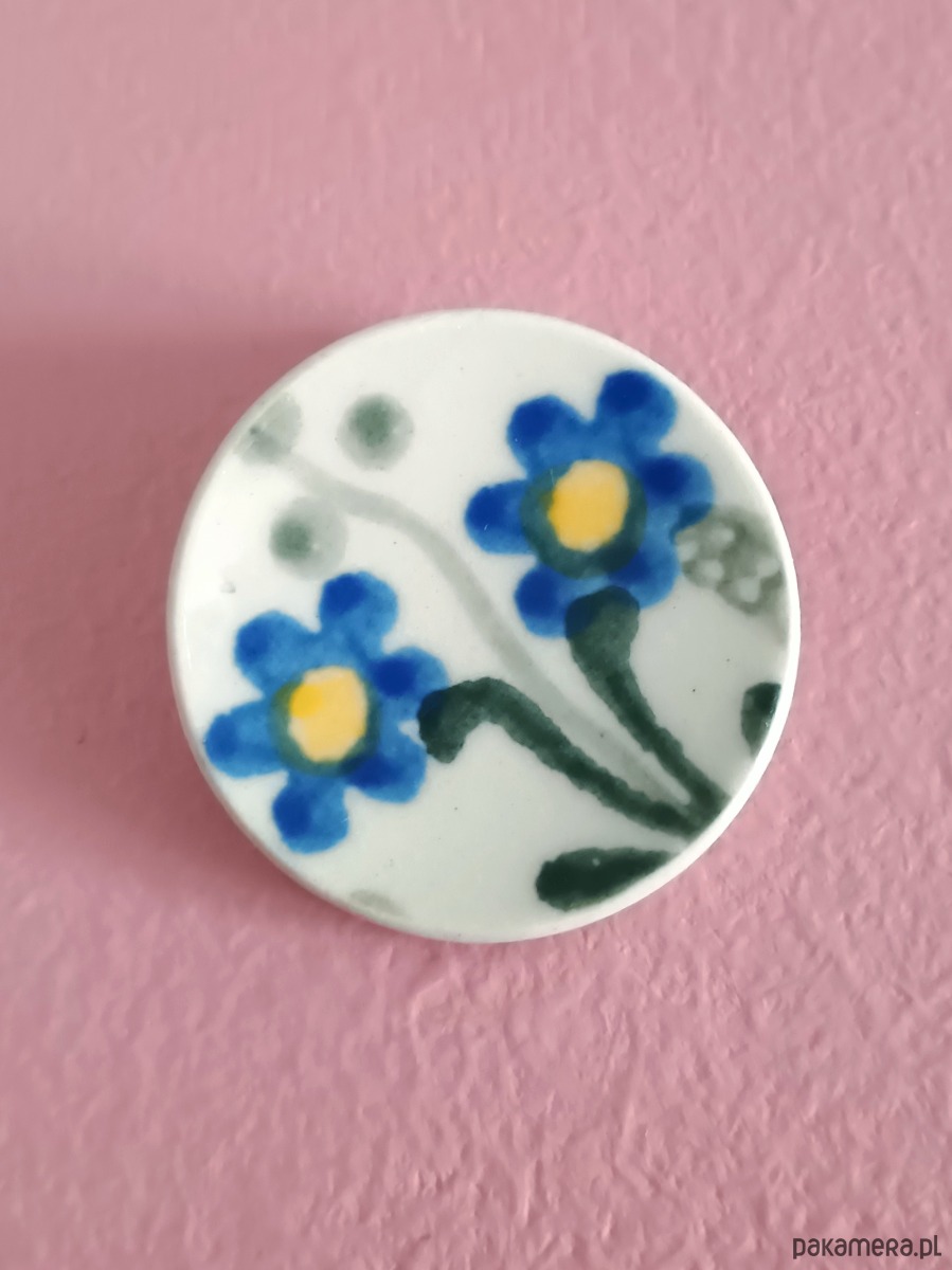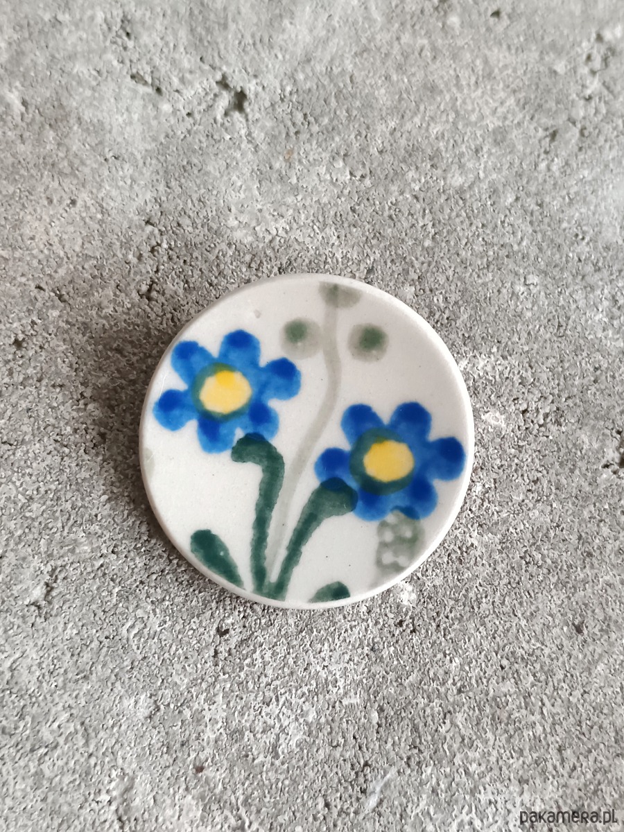 Ceramika w Bolesławcu i jego okolicach produkowana była już w XIV wieku. Do dziś najważniejszy surowiec, czyli glina wydobywany jest na miejscu, a tradycja wyrobu naczyń ceramicznych, rozwijana i kultywowana przez wieki - trwa. Bolesławiec jako marka, tworzona przez kilkadziesiąt różnych manufaktur, znana jest na całym świecie, a charakterystycznego wzoru w kobaltowe kropki nie sposób pomylić z żadnym innym. Co najbardziej wyróżnia Bolesławiec, to że szkliwo nakładane jest ręcznie, za pomocą stempelków z gąbki. Oto broszka, którą wykonałam z fragmentu stłuczonego talerza właśnie z Bolesławca. Kawałek stłuczki oszlifowałam w okrągły kształt i połączyłam z metalowym zapięciem. Ceramikę zeszlifowałam również z grubości - jest cieńsza niż pierwotnie, dzięki czemu przypinka nie jest ciężka. Brzegi i tył pokryłam lakierem, co sprawia, że nie brudzą się i nie chłoną wilgoci. Średnica elementu ceramicznego: 31 mm. Unikat - każdy z moich wyrobów występuje w jednym egzemplarzu. Upcykling - nie reprodukuję wykorzystywanych wzorów, niczego nie domalowuję - wykorzystuję wyłącznie oryginalne naczynia i motywy, które się na nich znajdują. Tym samym, stłuczce z odzysku nadaję nowe życie.
