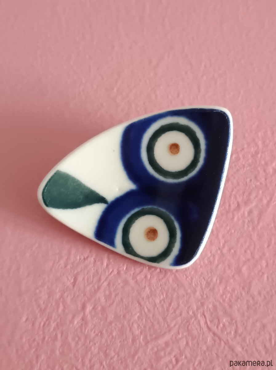 Ceramika w Bolesławcu i jego okolicach produkowana była już w XIV wieku. Do dziś najważniejszy surowiec, czyli glina wydobywany jest na miejscu, a tradycja wyrobu naczyń ceramicznych, rozwijana i kultywowana przez wieki - trwa. Bolesławiec jako marka, tworzona przez kilkadziesiąt różnych manufaktur, znana jest na całym świecie, a charakterystycznego wzoru w kobaltowe kropki nie sposób pomylić z żadnym innym. Co najbardziej wyróżnia Bolesławiec, to że szkliwo nakładane jest ręcznie, za pomocą stempelków z gąbki. Oto broszka, którą wykonałam z fragmentu stłuczonego talerza właśnie z Bolesławca (dekoracja nr 8, Pawie Oko). Kawałek stłuczki oszlifowałam w opływowy trójkątny kształt i połączyłam z metalowym zapięciem. Ceramikę zeszlifowałam również z grubości - jest cieńsza niż pierwotnie, dzięki czemu przypinka nie jest ciężka. Brzegi pokryłam lakierem, co sprawia, że nie brudzą się i nie chłoną wilgoci. Wymiary elementu ceramicznego: 31 x 41 mm. Unikat - każdy z moich wyrobów występuje w jednym egzemplarzu. Upcykling - nie reprodukuję wykorzystywanych wzorów, niczego nie domalowuję - wykorzystuję wyłącznie oryginalne naczynia i motywy, które się na nich znajdują. Tym samym, stłuczce z odzysku nadaję nowe życie.