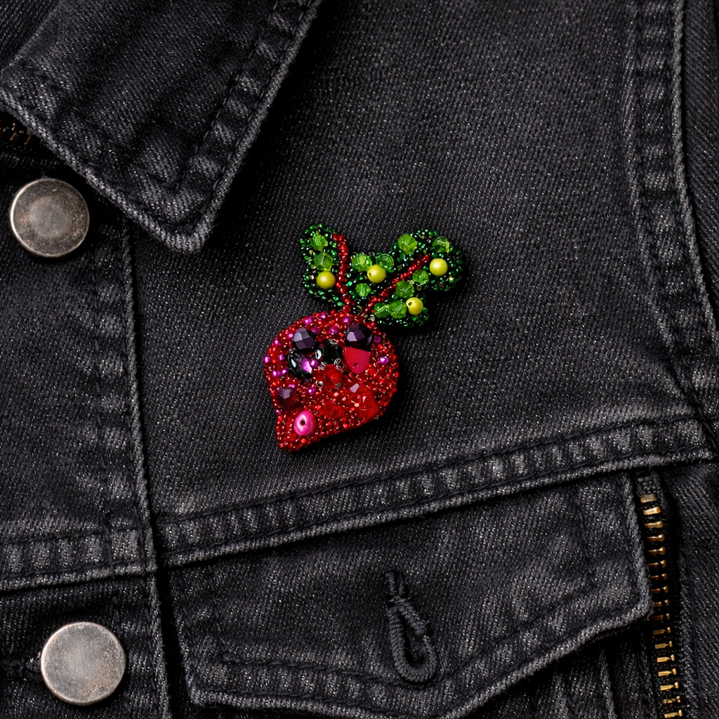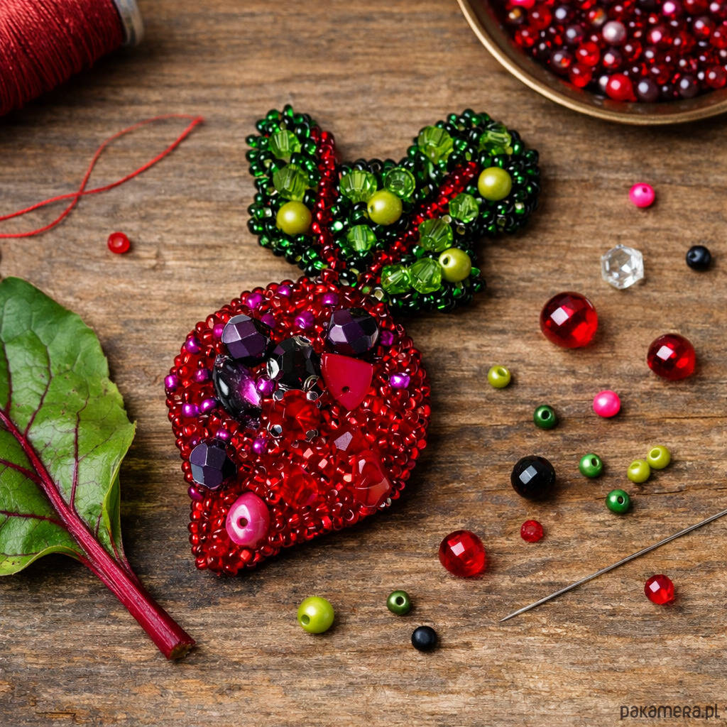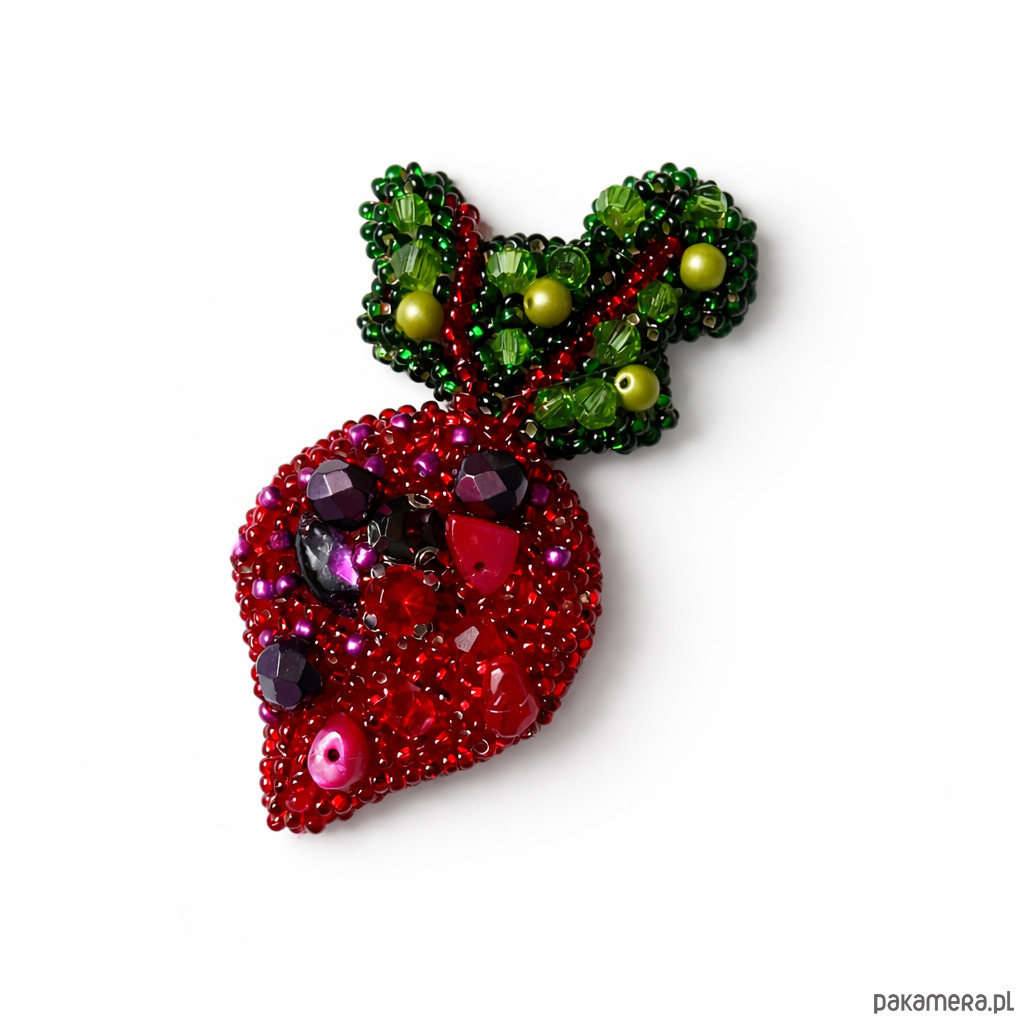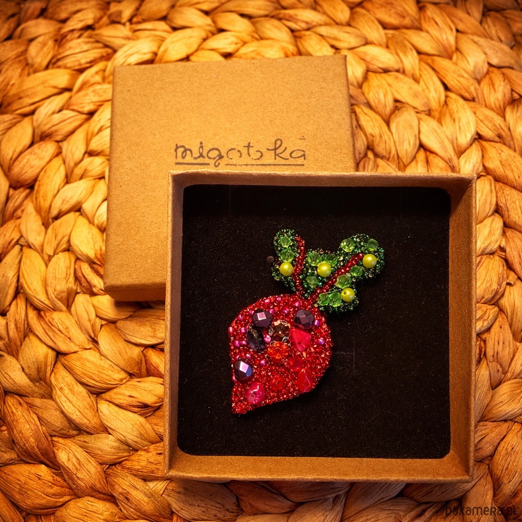 Wyjątkowa, ręcznie wykonana broszka w kształcie buraka, stworzona techniką haftu koralikowego. Misternie wyszywana z drobnych koralików oraz ozdobnych kryształków, zachwyca bogactwem faktur i głębią kolorów. Intensywna czerwień w połączeniu z zielonymi liśćmi nadaje biżuterii wyrazisty, artystyczny charakter.