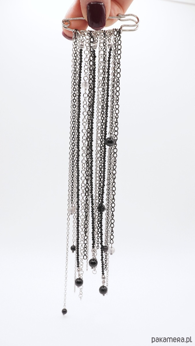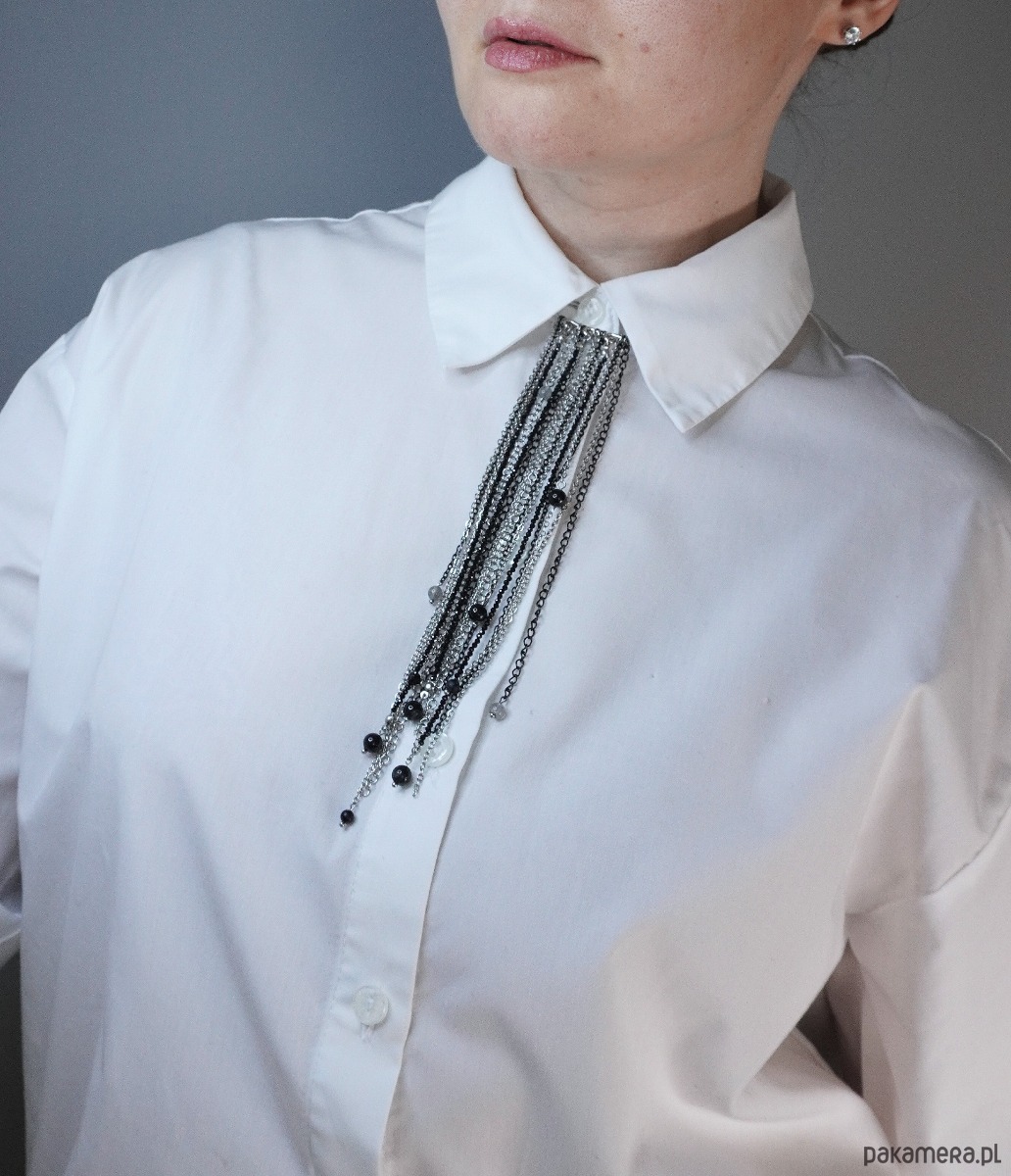 Jako biżuteryjny krawat: Przypięta pod kołnierzykiem koszuli tworzy nowoczesną, elegancką linię.