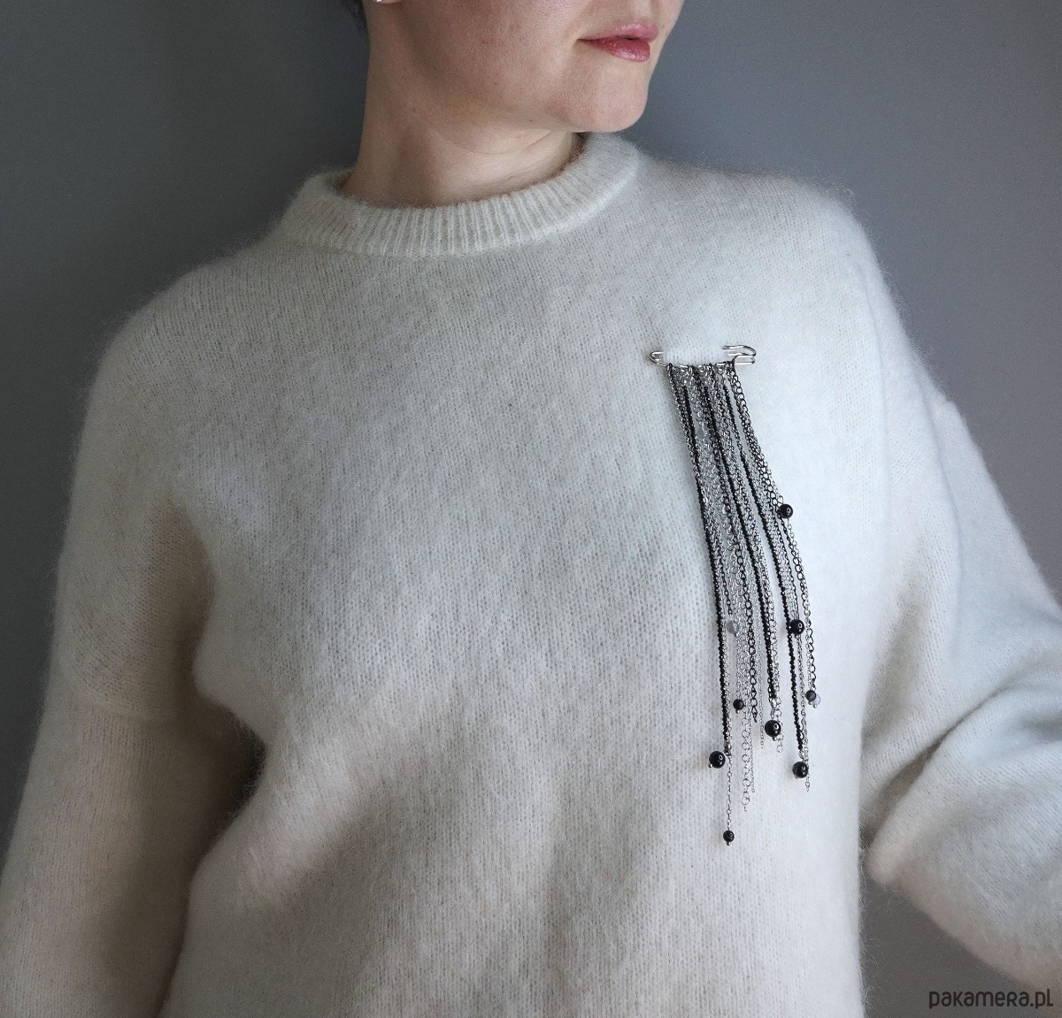 Akcent na swetrze: Idealnie przełamuje fakturę wełnianych i dzianinowych splotów.