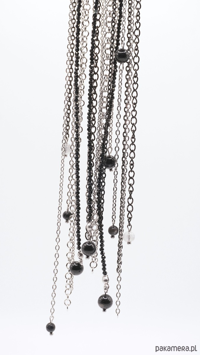 Projekt opiera się na kaskadzie różnorodnych łańcuchów ze stali szlachetnej, które płynnie reagują na każdy ruch. Turmalin dodaje kompozycji unikalności — jego ciemne, niemal czarne ziarna pod odpowiednim kątem rozbłyskują idealnie współgrając z labradorytem.