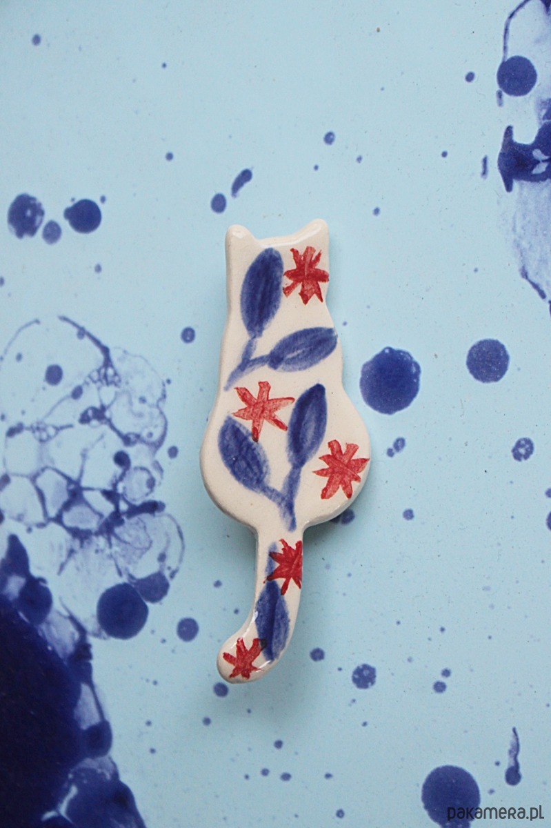 Broszka ceramiczna kot malowany w liście