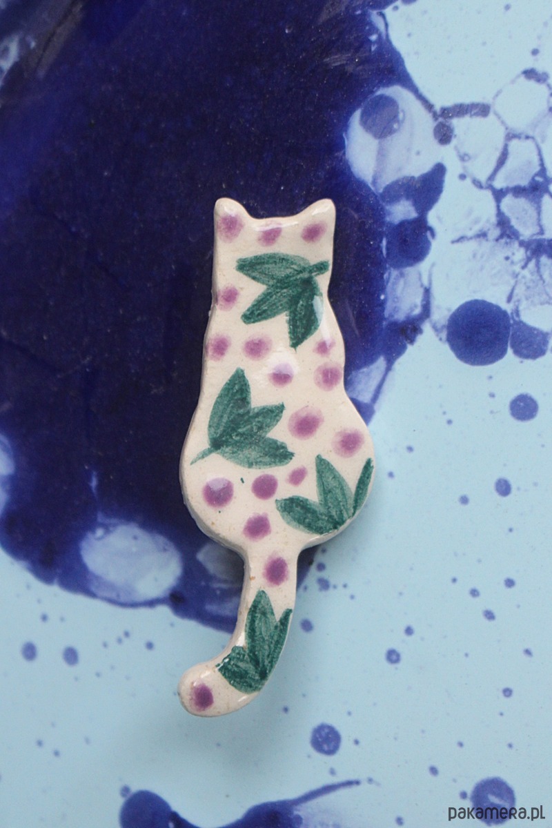 Wzór w fioletowe kropki i ciemnozielone liście.