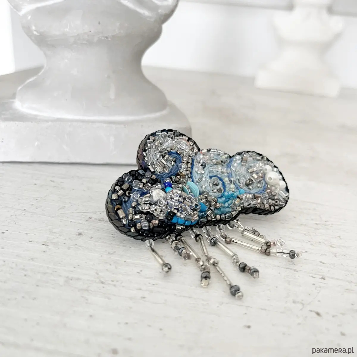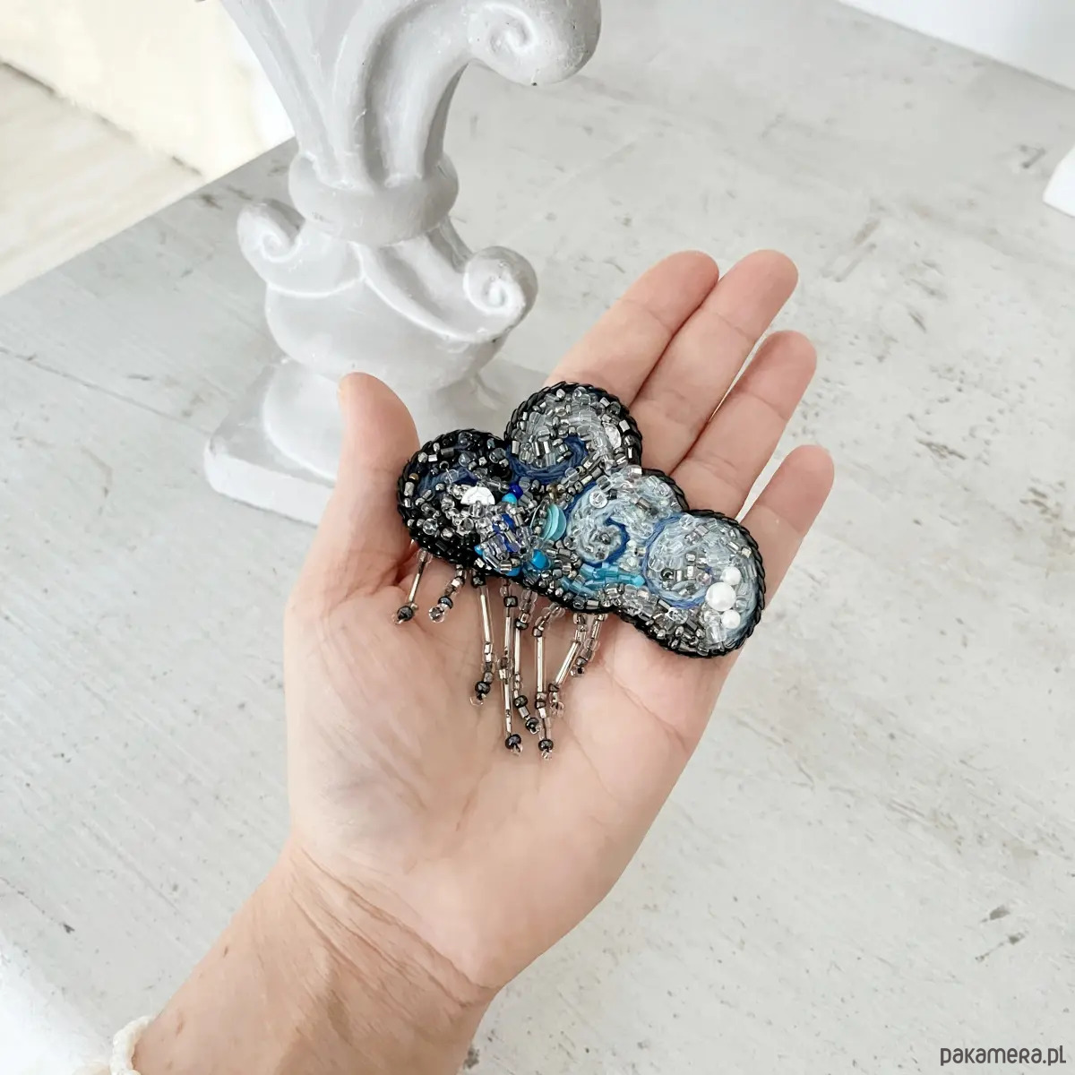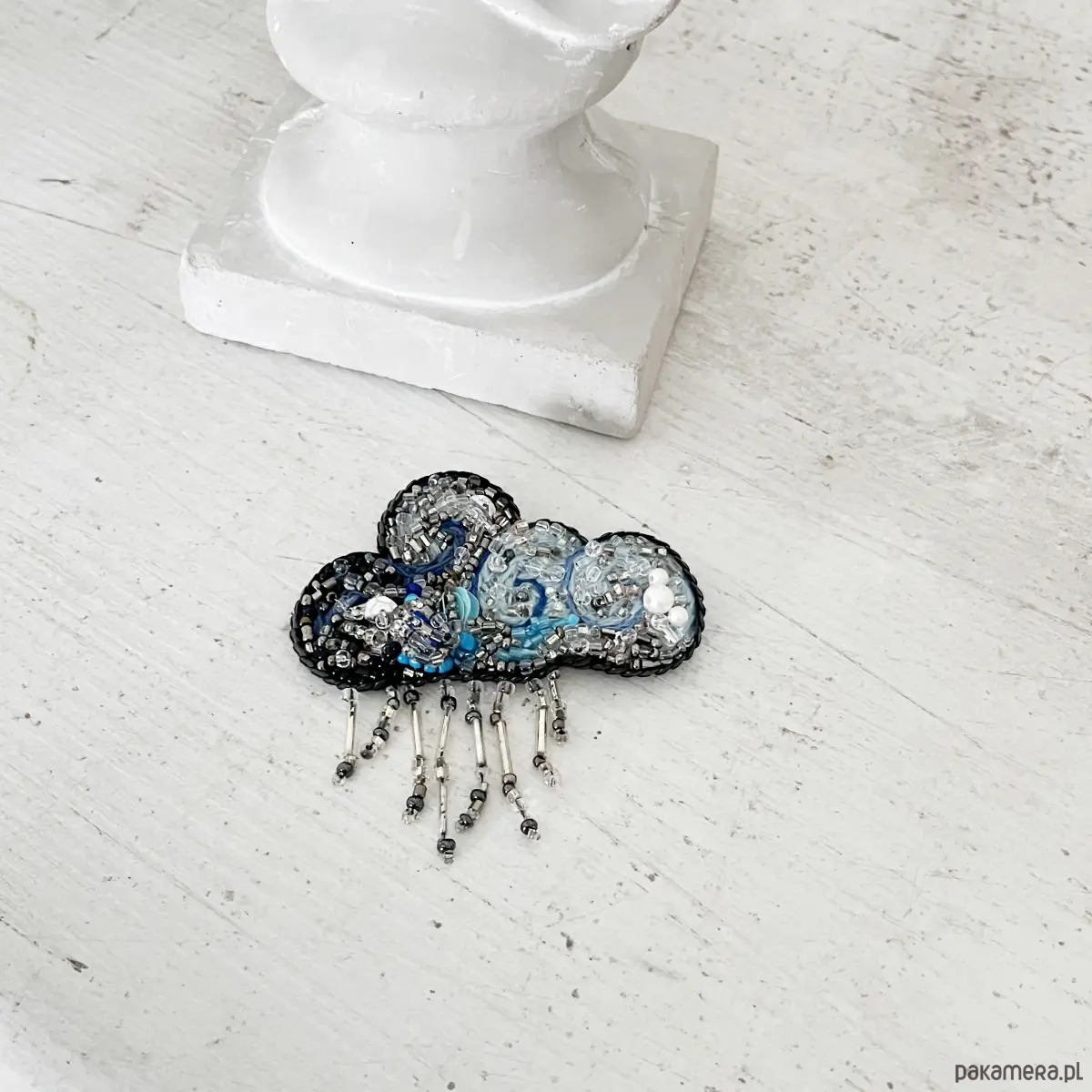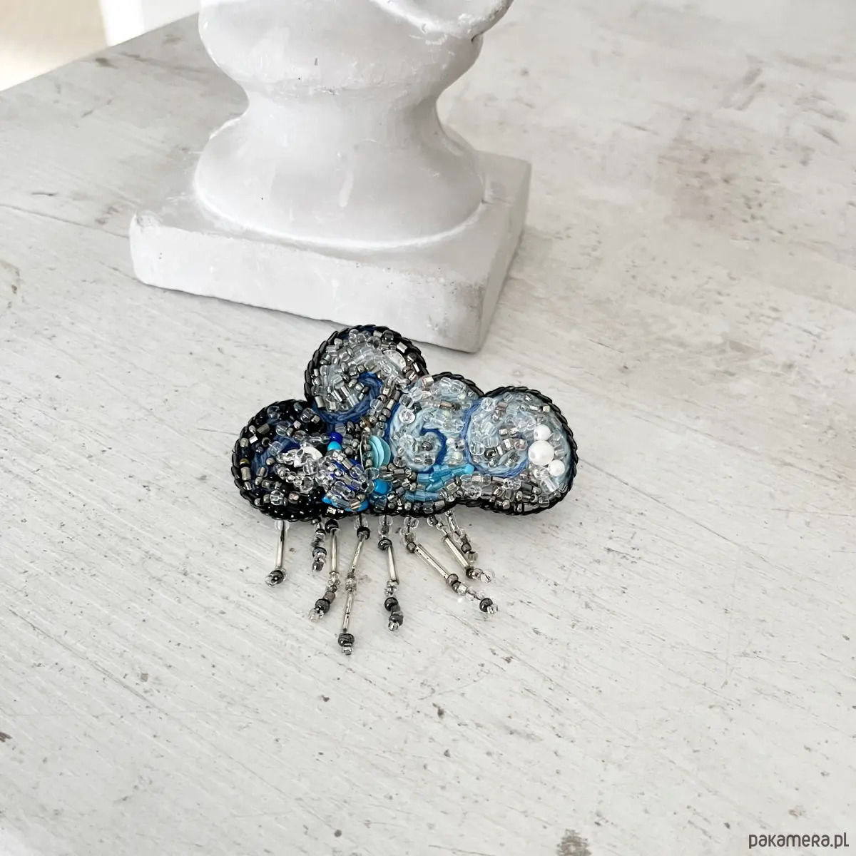 Broszka CHMURKA 3 ręcznie haftowana przypinka koraliki