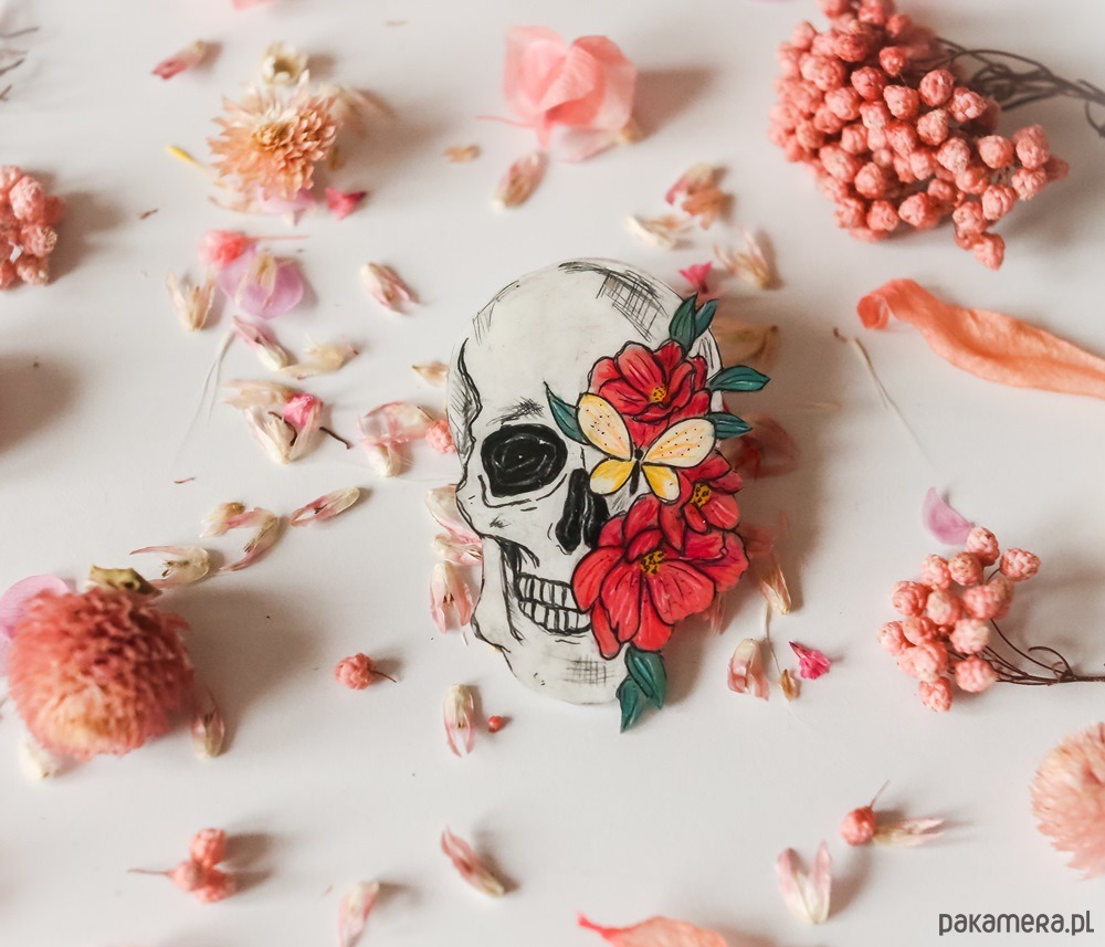 Broszka z czaszka to upiornie piękna biżuteria na Halloween, została ręcznie narysowana kredkami i zabezpieczona kilkoma warstwami błyszczącego lakieru ekologicznego.