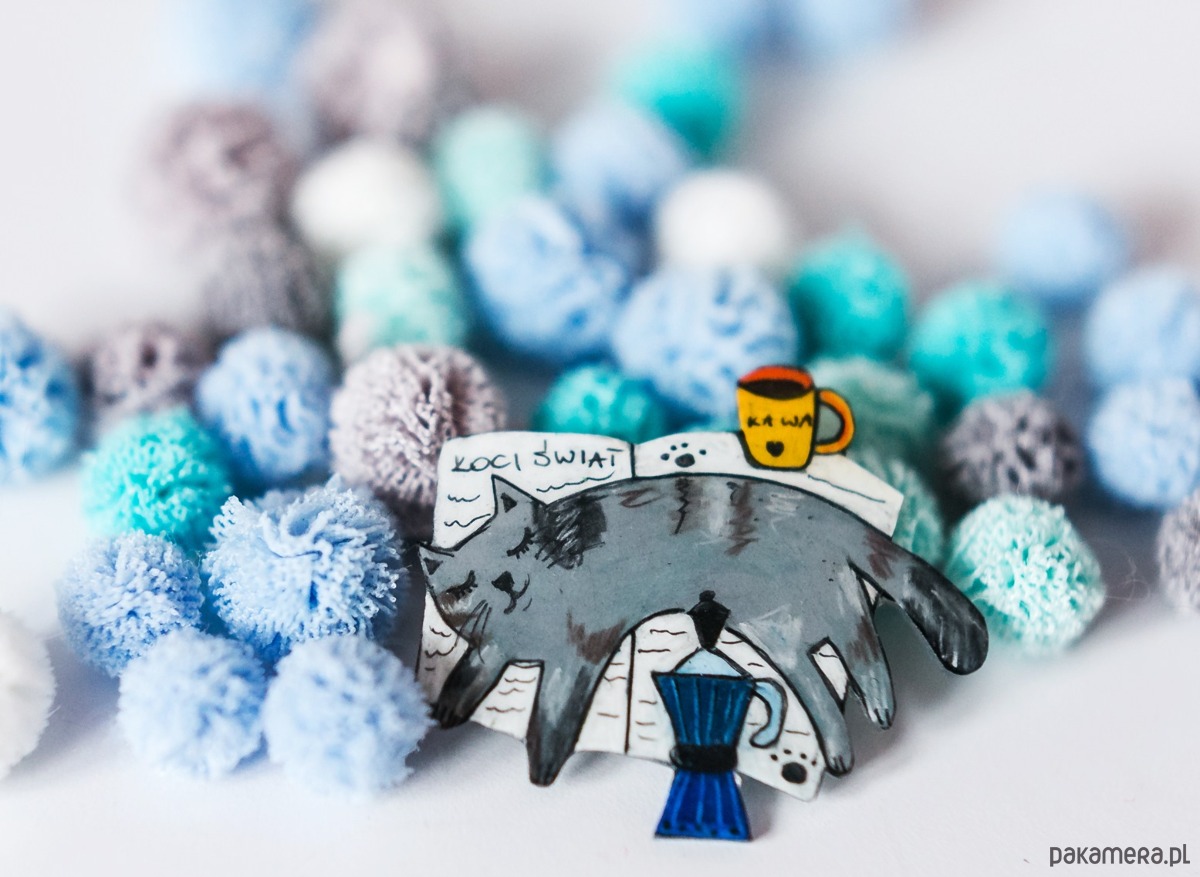 Broszka została ręcznie narysowana kredkami przez kocią matkę.
