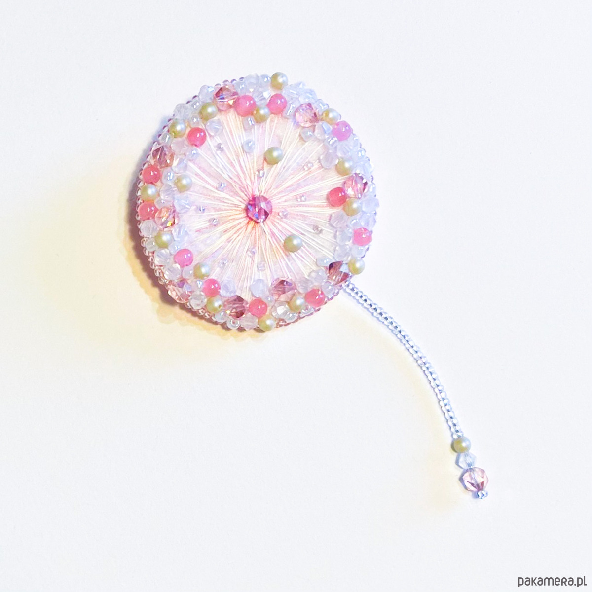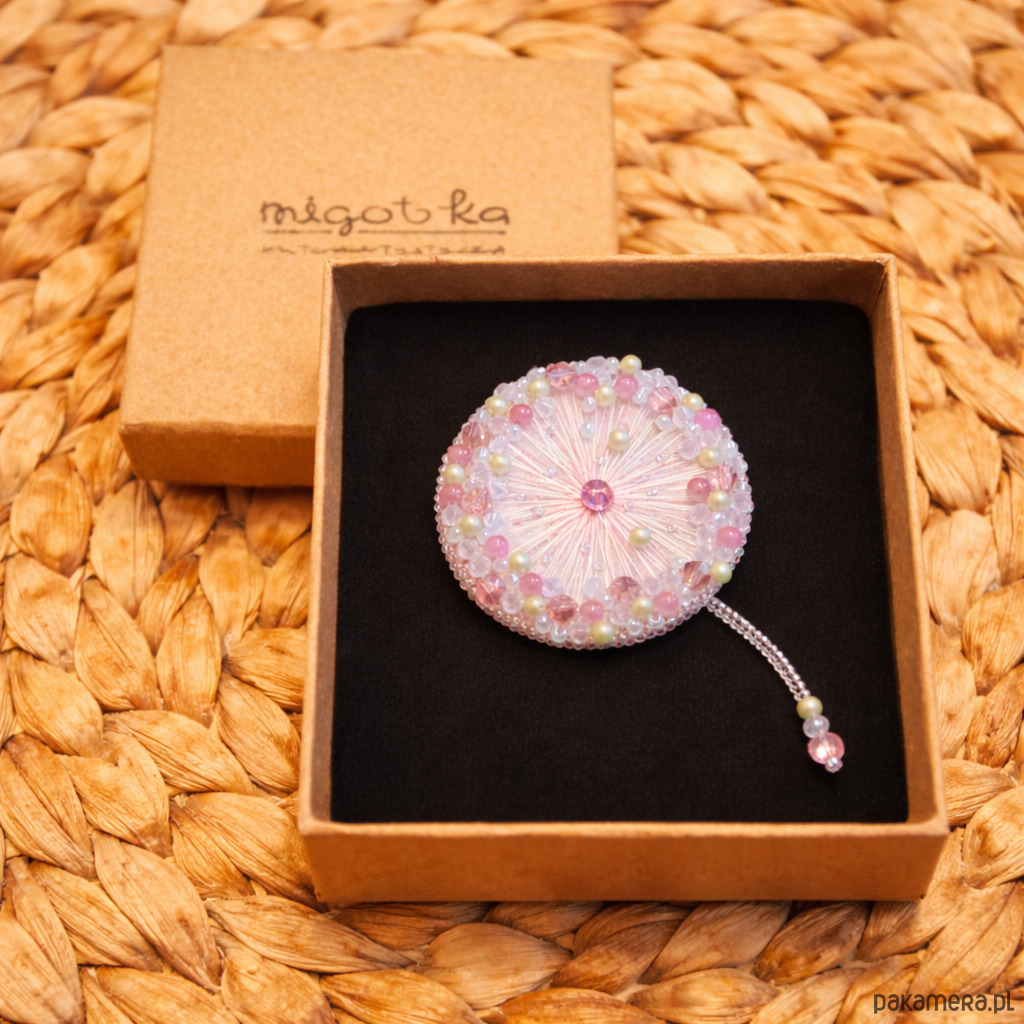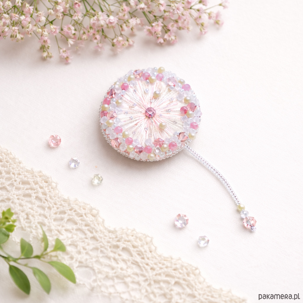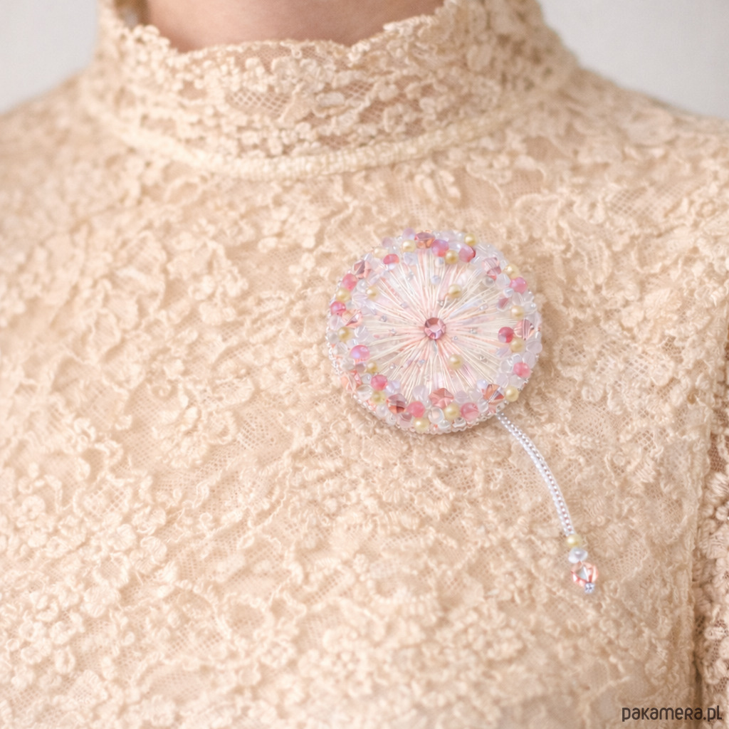 Delikatna i eteryczna broszka wykonana ręcznie techniką haftu koralikowego. Inspirowana lekkością dmuchawca i chwilą, gdy wiatr unosi jego nasiona – subtelna, kobieca i pełna blasku.