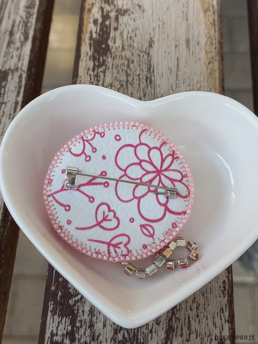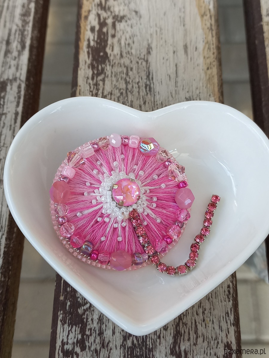 Niepowtarzalna, ręcznie szyta broszka, wykonana metodą haftu koralikowego i haftu ręcznego. Każdy koralik wyszywany jest pojedynczo, dzięki czemu ozdoba jest unikatowa i wyjątkowa. Broszka ma wielkość około 4 cm średnicy, wykończenia stalowe w kolorze srebrnym, zapięcie typu agrafka. Od spodu podszyta jest ekoskórką z wzorem.
