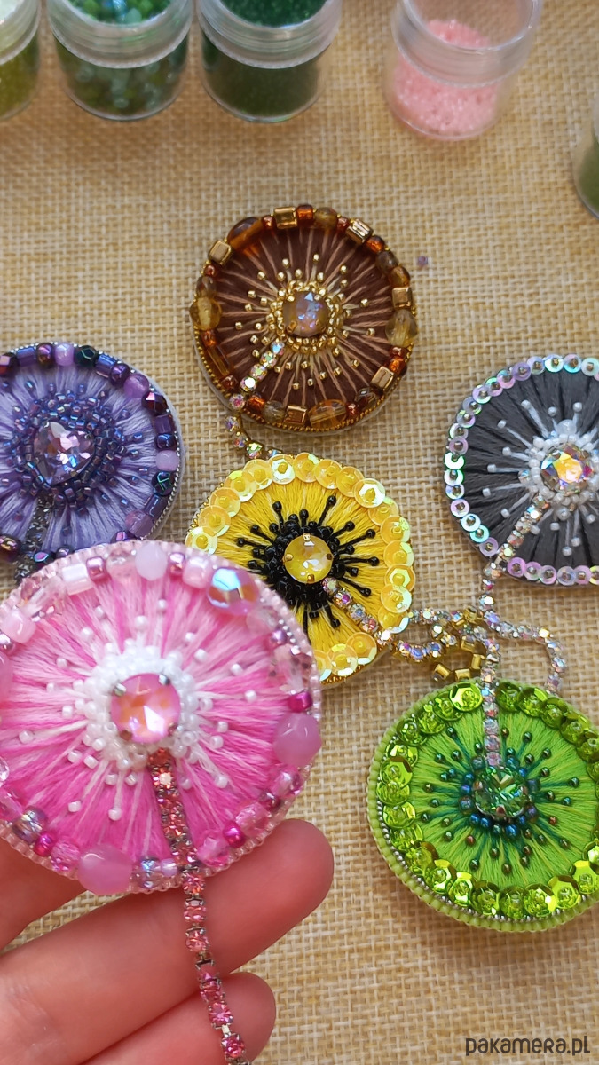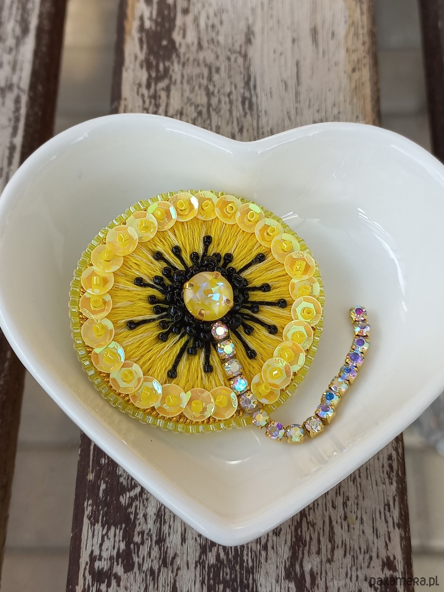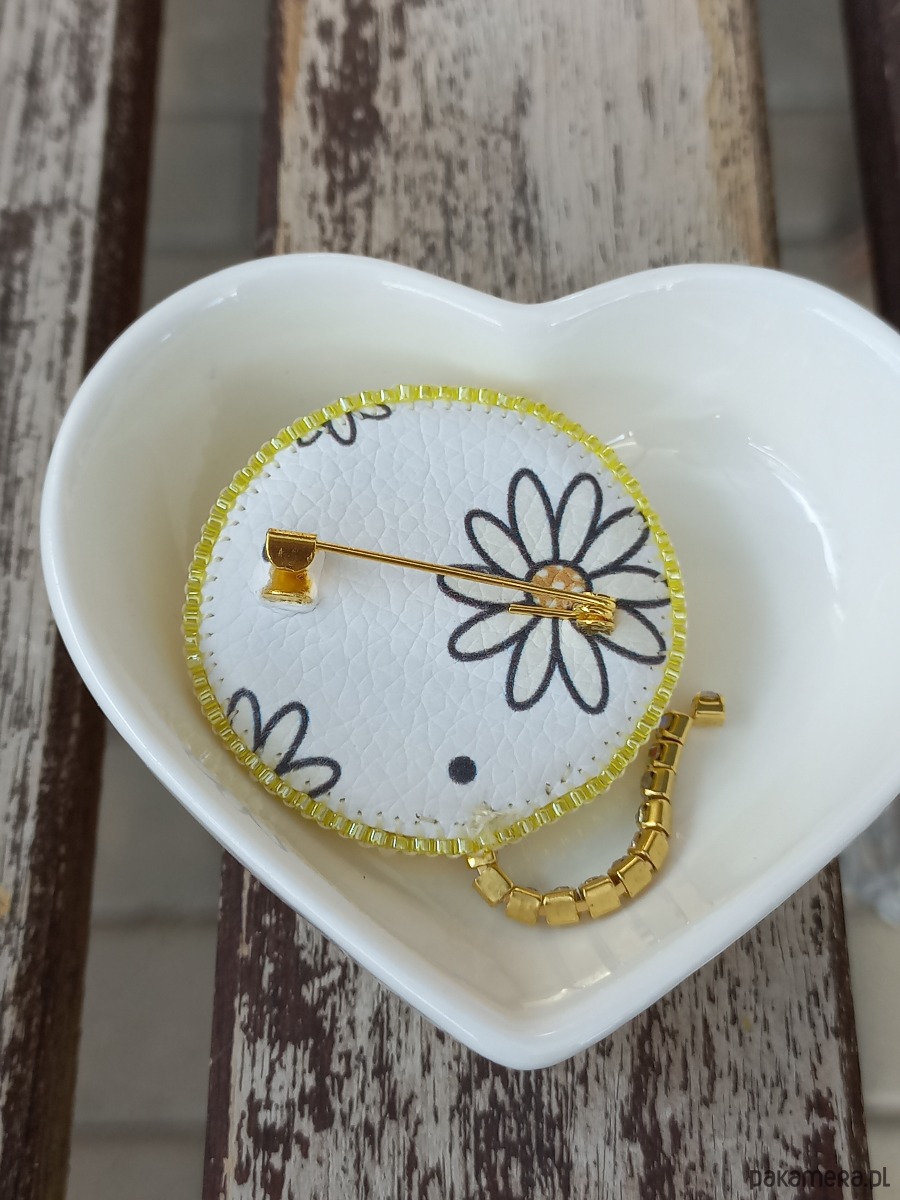 Niepowtarzalna, ręcznie szyta broszka, wykonana metodą haftu koralikowego i haftu ręcznego. Każdy koralik wyszywany jest pojedynczo, dzięki czemu ozdoba jest unikatowa i wyjątkowa. Broszka ma wielkość około 4 cm średnicy, wykończenia stalowe w kolorze złotym, zapięcie typu agrafka. Od spodu podszyta jest ekoskórką z wzorem.