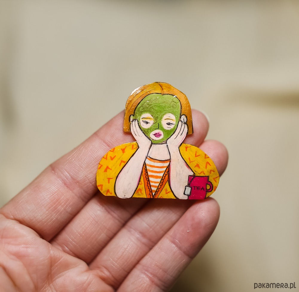 Broszka przedstawiająca Agatę z maseczką na twarzy to oryginalny i wyrazisty dodatek, który łączy humor z domową codziennością. Starannie wykonana, przyciąga wzrok detalami i charakterystycznym wyrazem postaci. Idealna jako nietuzinkowa ozdoba do płaszcza, torby lub swetra, a także jako pomysłowy prezent.