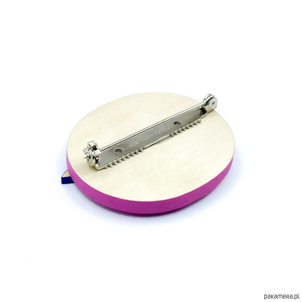 Broszka została wykonana ręcznie, z drewna brzozowego. Jest pokryta farbą akrylową w kolorze kobaltowym oraz wodnym, matowym i ekologicznym lakierem.