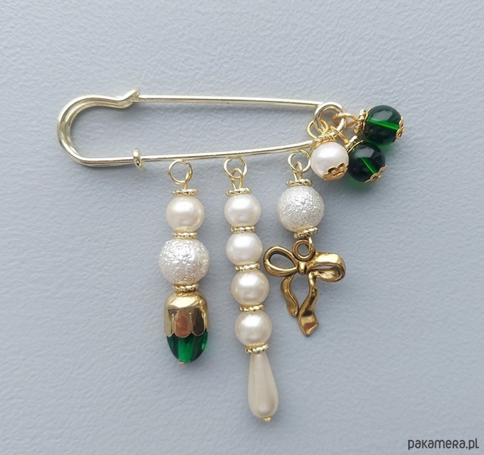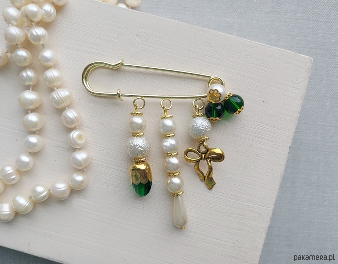 Broszka agrafka zapnie gruby szalik, poncho, etolę lub ozdobi sweter z grubym splotem i doda szczypty vintage. Broszkę zdobią perły i zawieszki.