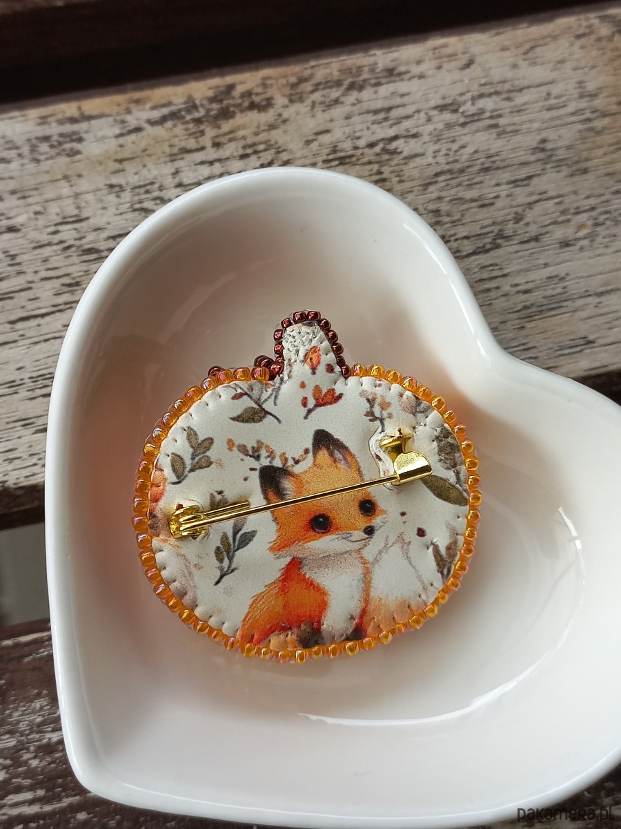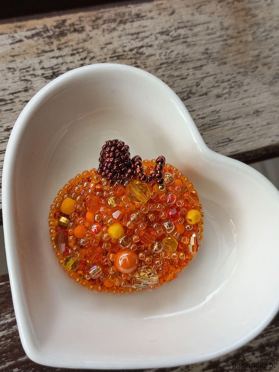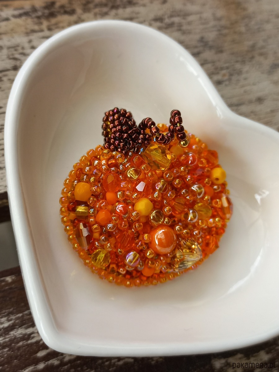 Niepowtarzalna, ręcznie szyta broszka, wykonana metodą haftu koralikowego. Każdy koralik wyszywany jest pojedynczo, dzięki czemu ozdoba jest unikatowa i wyjątkowa. Broszka ma wielkość około 4 cm długości i około 4 cm szerokości, wykończenia stalowe w kolorze złotym, zapięcie typu agrafka. Od spodu podszyta jest ekoskórką z wzorem.