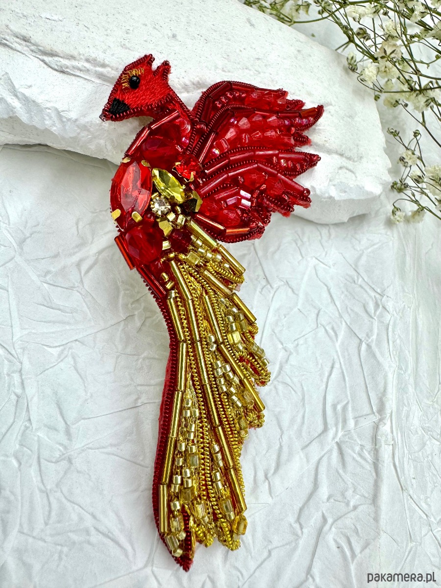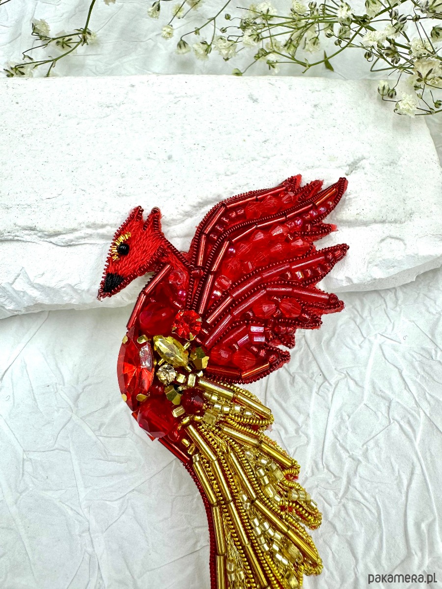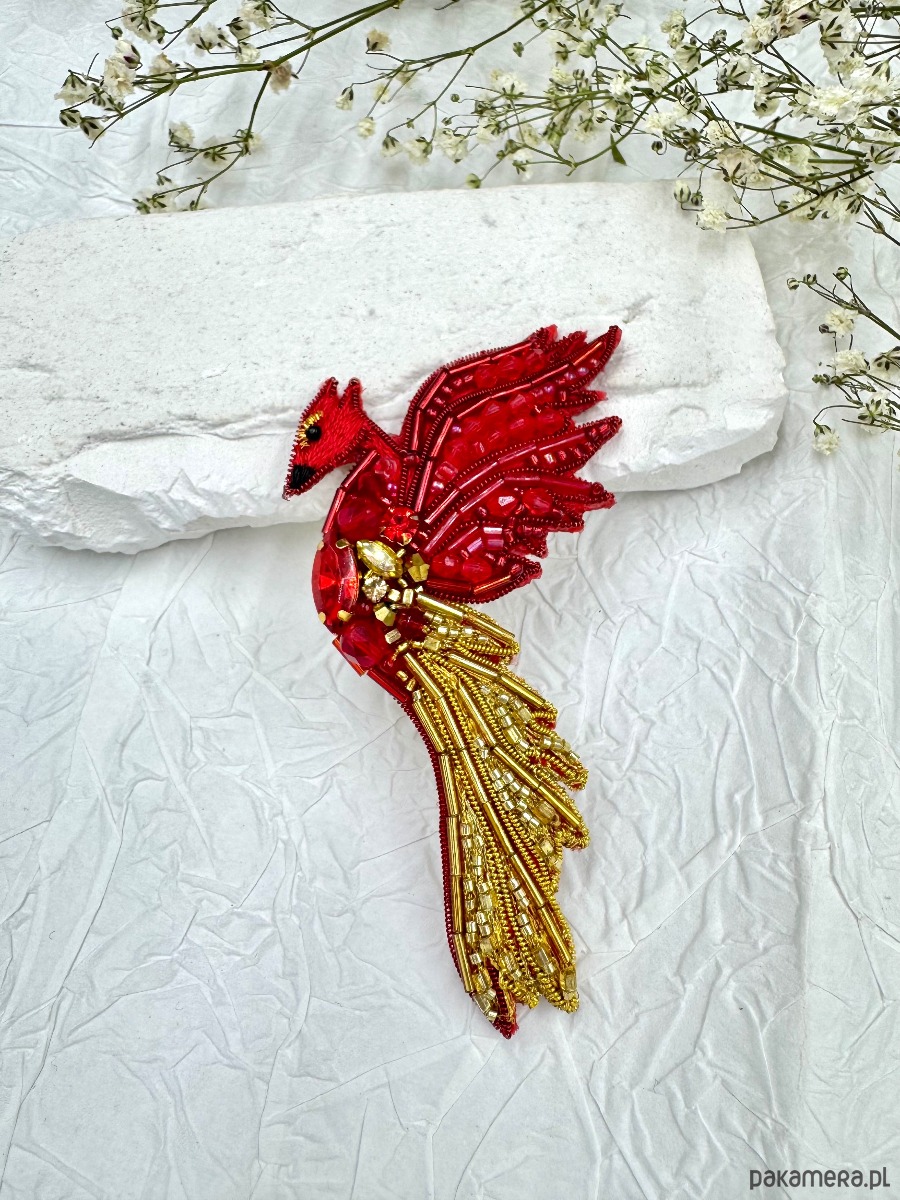 Poznaj Feniksa — wyjątkową, ręcznie wykonaną broszkę, która zachwyca intensywną czerwienią i złotym blaskiem. To nie tylko biżuteria — to symbol siły, odwagi i nieustannego odradzania się.