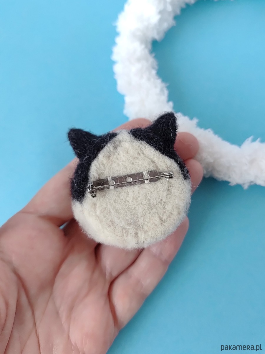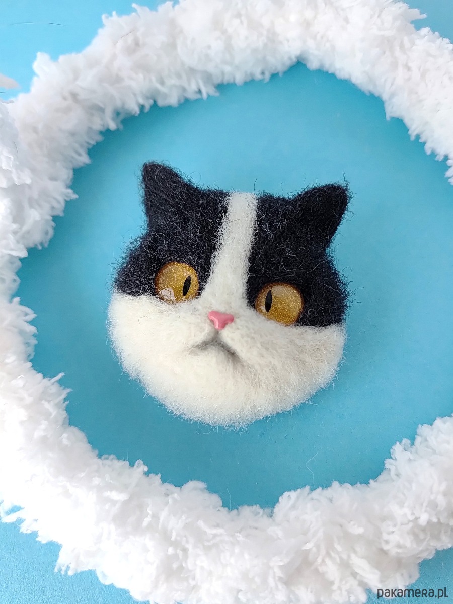 Materiały: wełna do filcowania, oczka ze szkła, nosek z gliny polimerowej, zapięcie ze stali nierdzewnej.