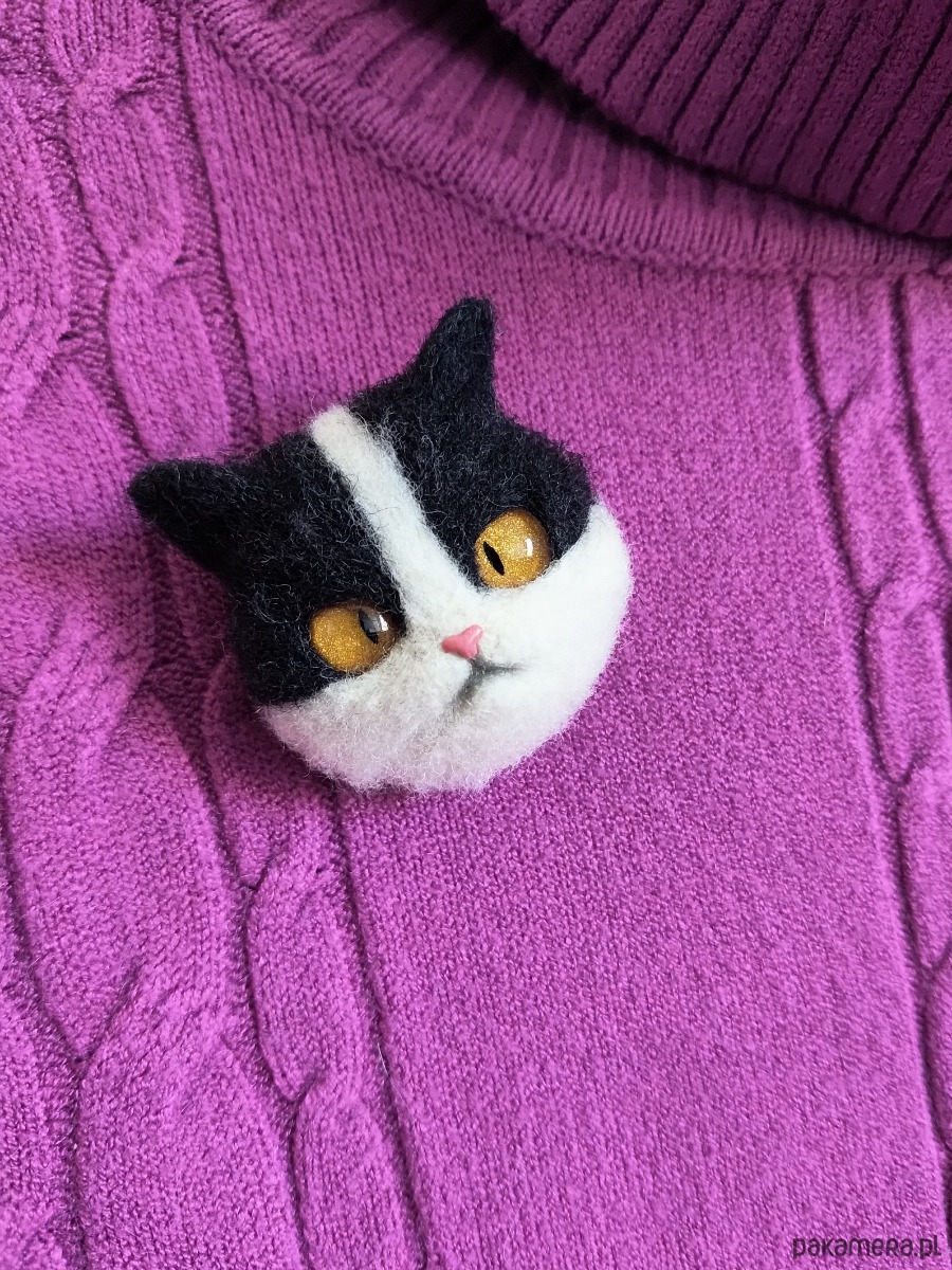 Ręcznie filcowana broszka przedstawiająca kota z charakterem — trochę poważny, trochę rozczulający.