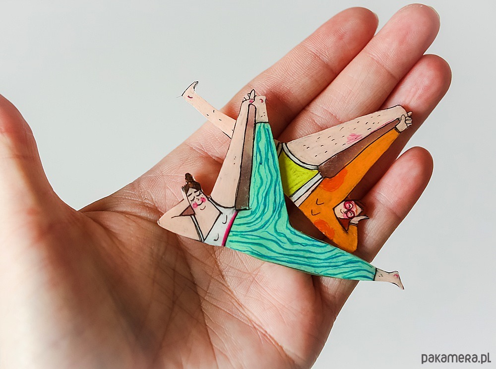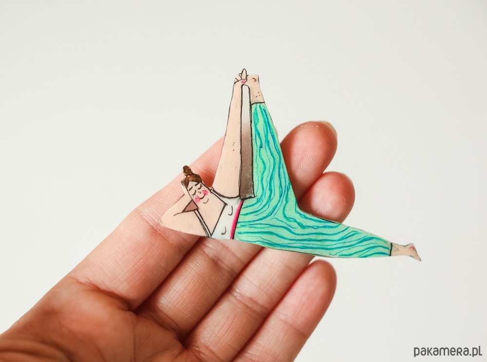 Broszka została ręcznie narysowana kredkami na folii termokurczliwej.