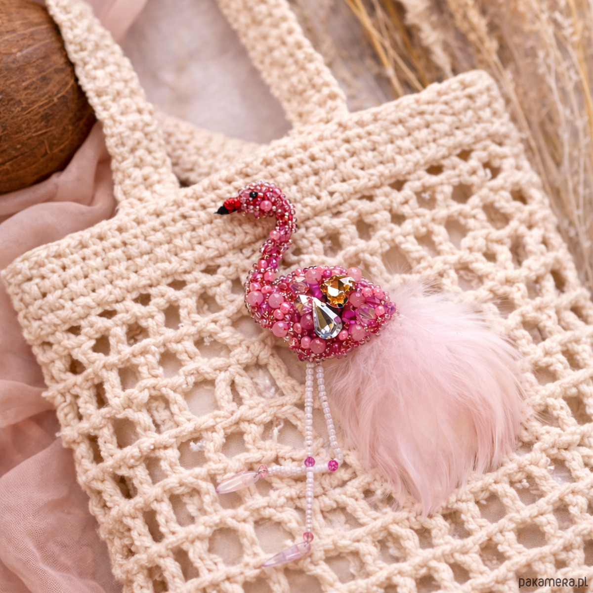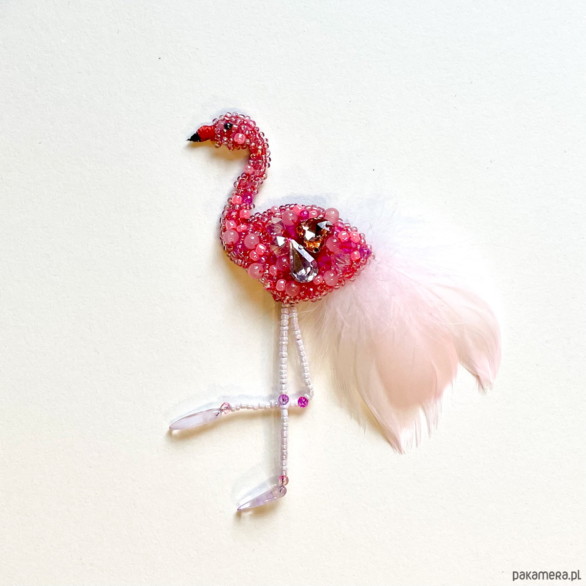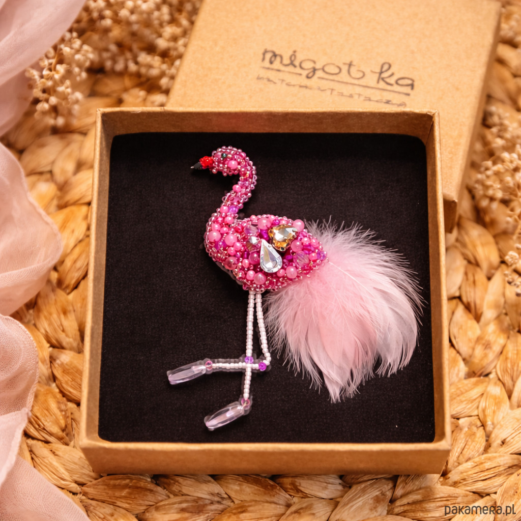 Ręcznie wykonana broszka w kształcie flaminga, stworzona w technice haftu koralikowego z dbałością o każdy detal. Kompozycja z różowych koralików, kryształków i delikatnego pióra nadaje jej lekkości, elegancji i subtelnego blasku. Broszka jest efektowna, ale jednocześnie bardzo kobieca – idealna jako biżuteryjny akcent do marynarki, swetra, sukienki, torby czy boho stylizacji.