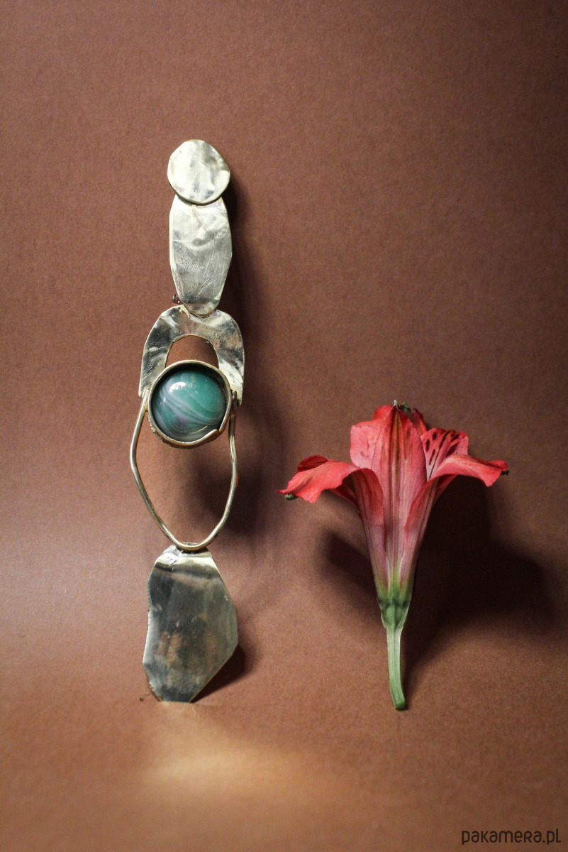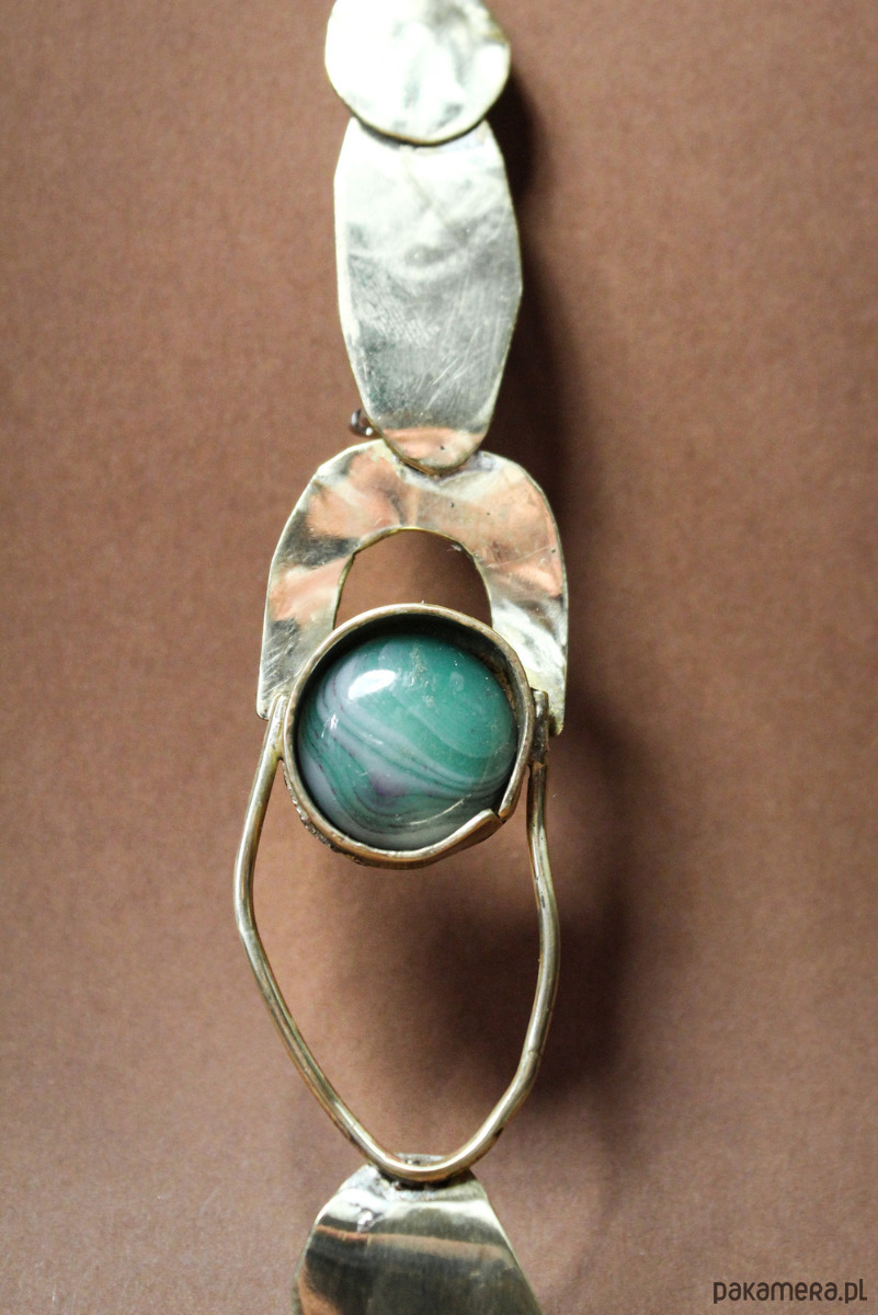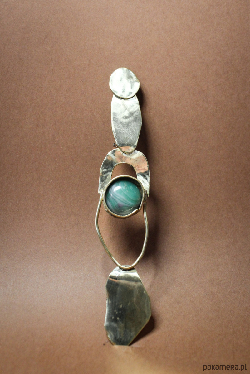 Ręcznie wykonana broszka inspirowana matematyczną abstrakcją.To połączenie surowego mosiądzu z sercem naturalnego kamienia Agatu o barwie zieleni. Rzemieślniczy i luksusowy dodatek o niepowtarzalnym charakterze.