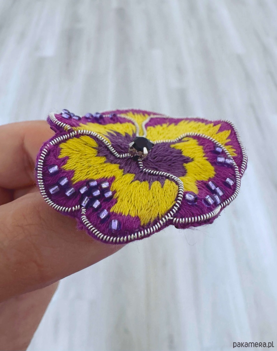 Ręcznie haftowana broszka w kształcie bratka, utrzymana w intensywnych odcieniach fioletu i żółci. Starannie wyszywana nićmi, ozdobiona drobnymi koralikami oraz centralnym kryształkiem, który nadaje całości biżuteryjnego charakteru.