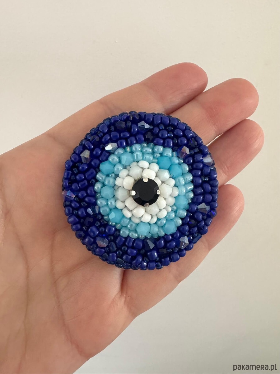 Broszka została wykonana z drobnych koralików i kryształków, starannie haftowanych ręcznie, co nadaje jej głębi, subtelnego połysku i unikatowego charakteru. Centralny, ciemny kryształ podkreśla motyw oka i dodaje całości elegancji.