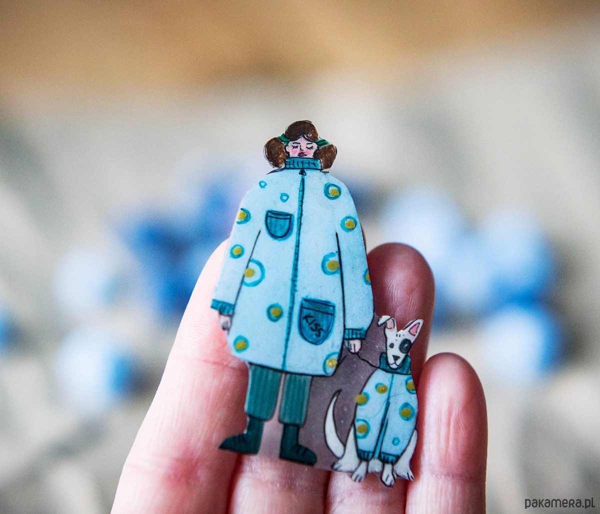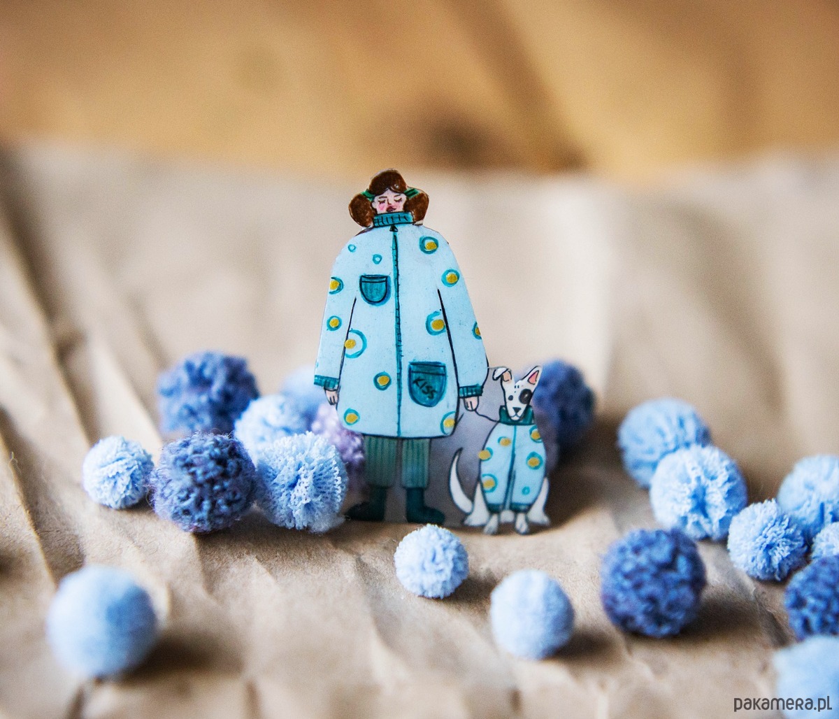 Urokliwa broszka dla każdej psiary – przedstawiająca modną Halinę z jej wiernym bulterierem Dymkiem. Ilustracja ma humorystyczny charakter i przyciąga wzrok stylowym, autorskim rysunkiem. To drobny, ale wyrazisty dodatek, który świetnie podkreśli miłość do czworonogów. Broszka zapakowana jest w estetyczny, tekturowy kartonik, idealna na prezent dla miłośniczek psów i dobrego stylu.