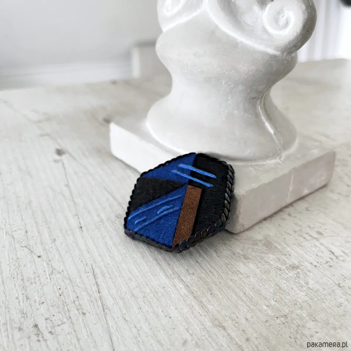 Nowoczesna, abstrakcyjna kompozycja w odcieniach indygo, czerni i głębokiego brązu nawiązuje do miejskiego minimalizmu i rytmu codzienności. Geometryczne kształty i ręczne wykonanie tworzą unikatową formę. Broszka powstała tylko w jednym egzemplarzu.