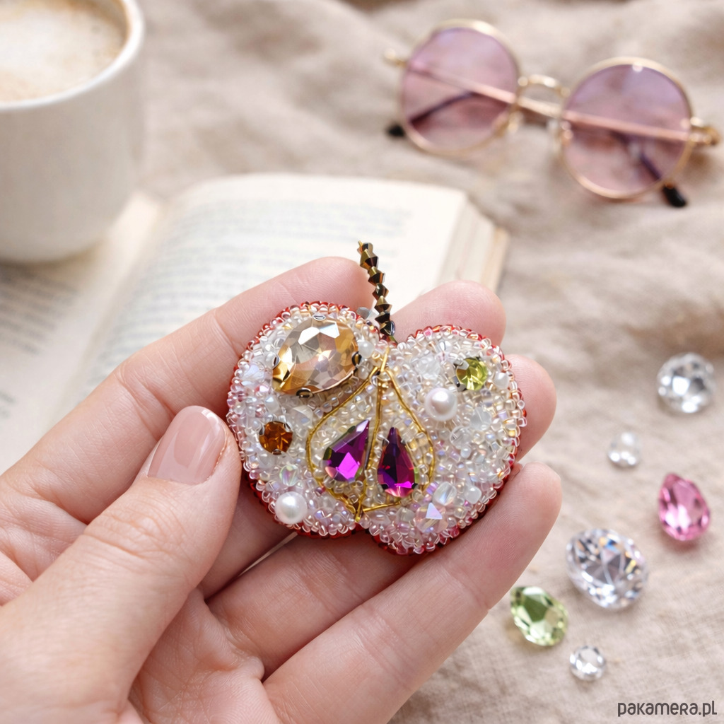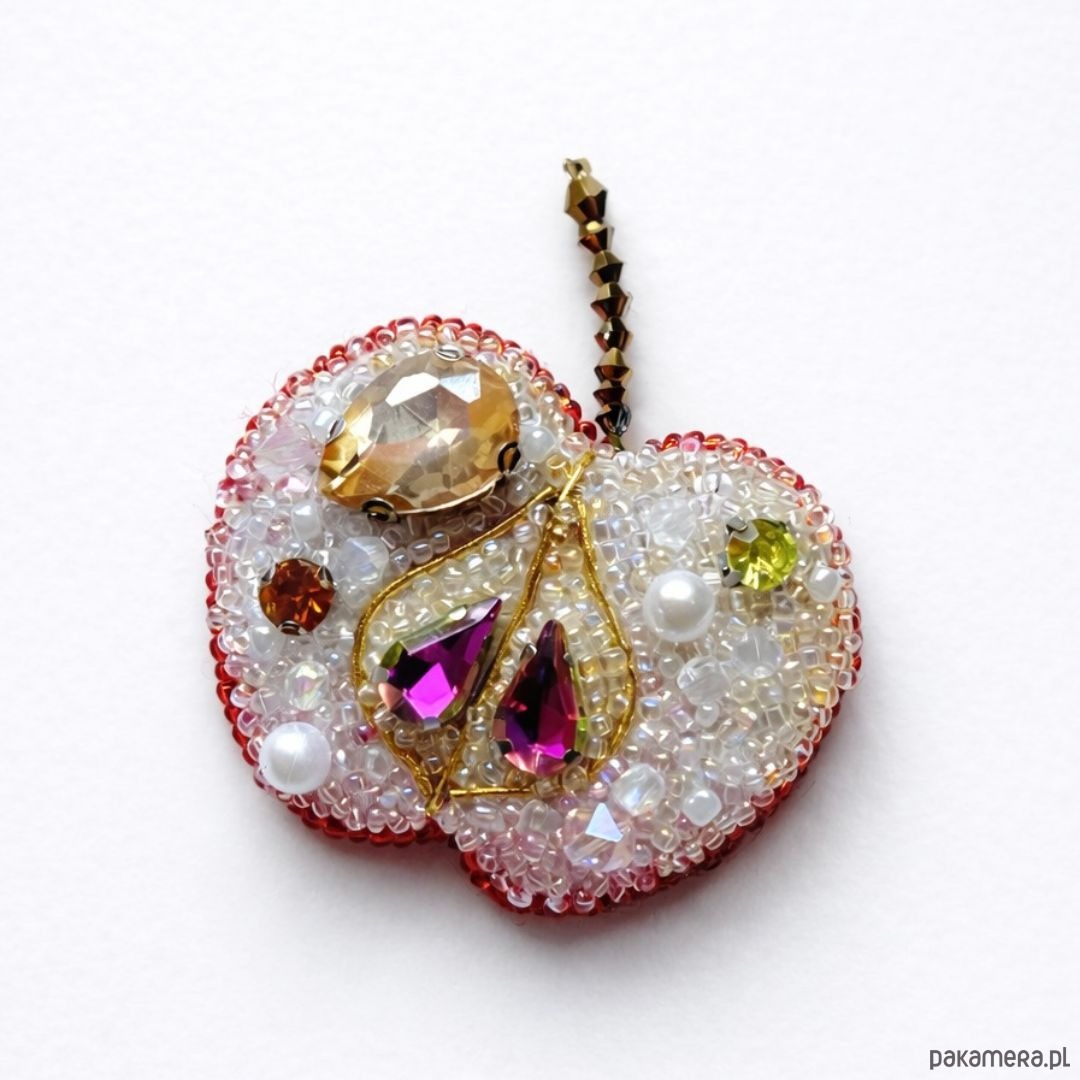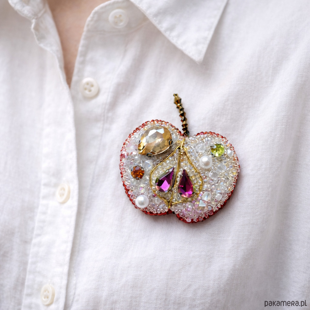 Wyjątkowa broszka w kształcie jabłka, wykonana ręcznie techniką haftu koralikowego. Każdy detal został starannie wyszyty drobnymi koralikami oraz ozdobiony kryształkami i perłowymi elementami, które pięknie odbijają światło. Broszka ma delikatną, artystyczną formę i subtelnie łączy romantyczny charakter z oryginalnym designem.